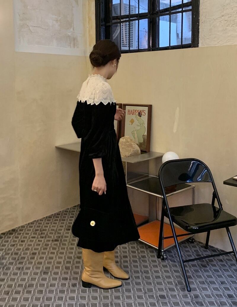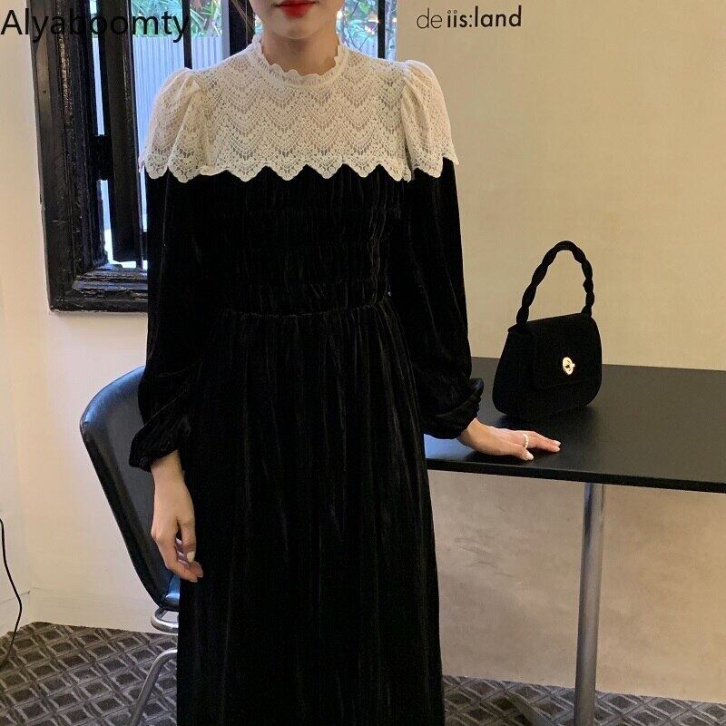 送料無料୨♥୧ スプリングオータムレディースロングドレス レースパッチワーク長袖スリーブブラックベルベット 春物 秋物 AOS287164608