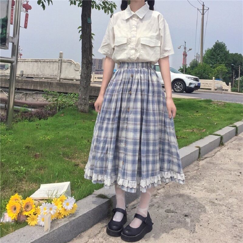 送料無料୨♥୧ スタイルレディーススカート ウェストヴィンテージ格子柄フリルミディ コットン ラッフル 大人ガーリー スウィート キュート カジュアル ビンテージ AOS44733573244