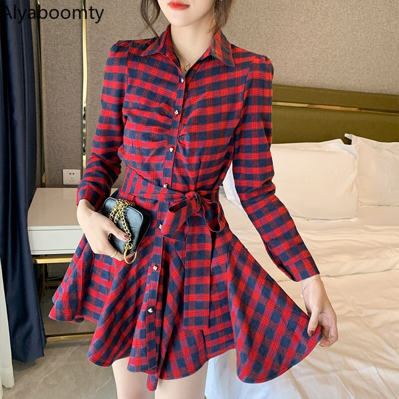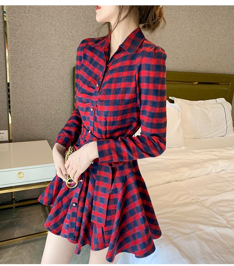 送料無料୨♥୧ スタイルオータムスプリングレディースミニAラインドレス カラーレッド格子柄シャツ フリル ラッフル 春物 秋物 AOS46112620552