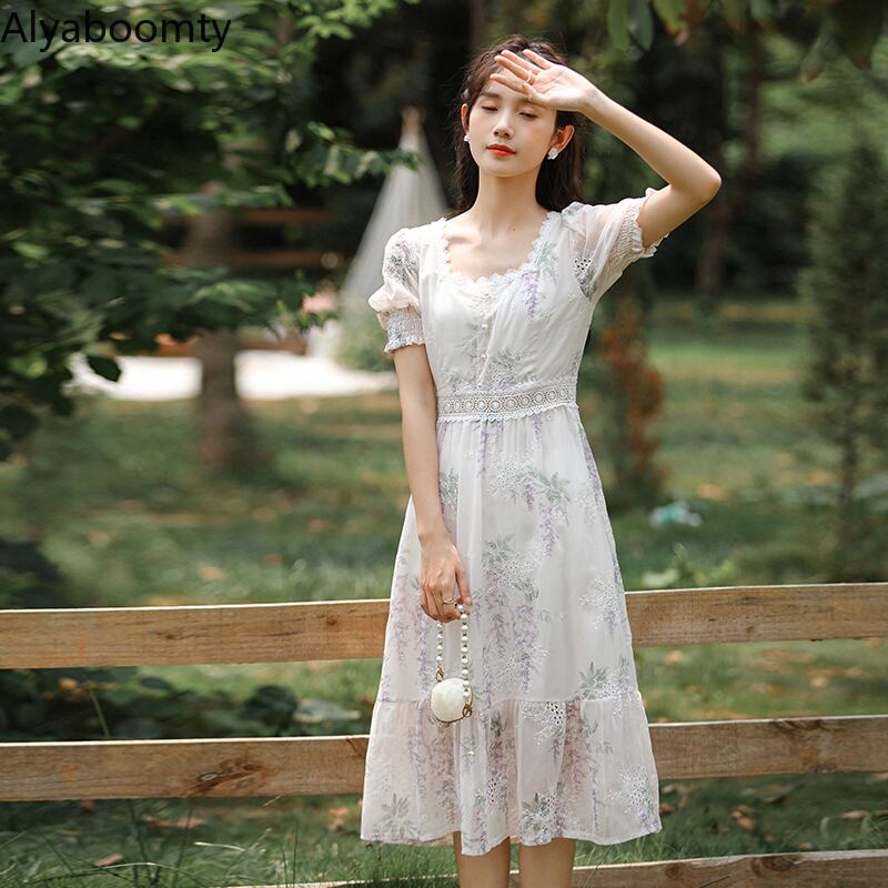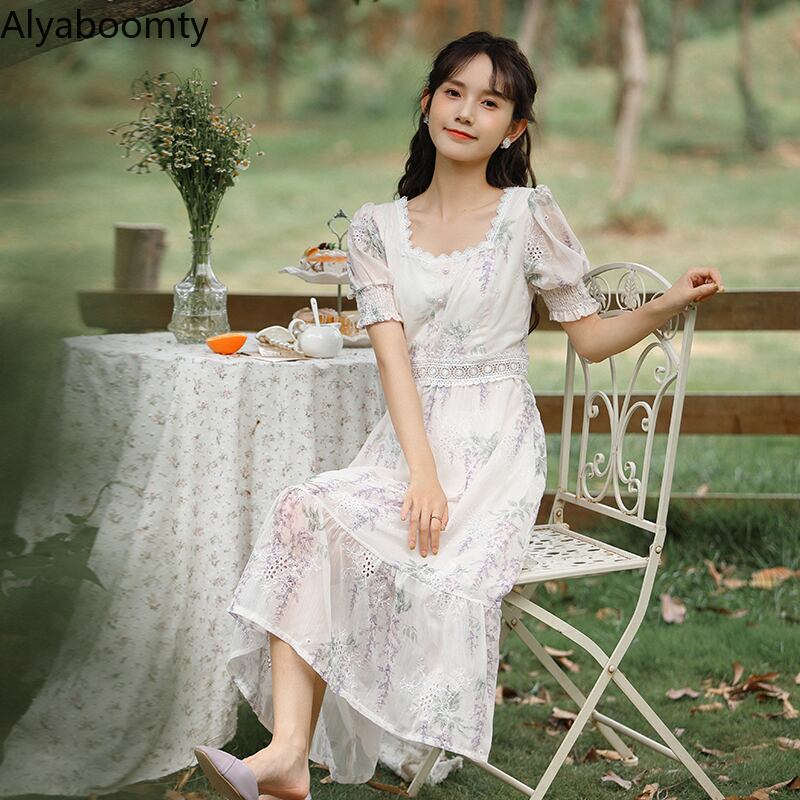 送料無料୨♥୧ サマーレディースロングヴィンテージドレス カラー刺繍シフォンフローラルミディ 夏物 花柄 スクウェア ビンテージ AOS89719292811