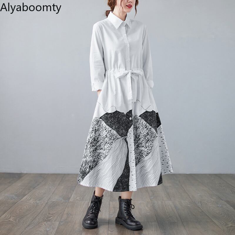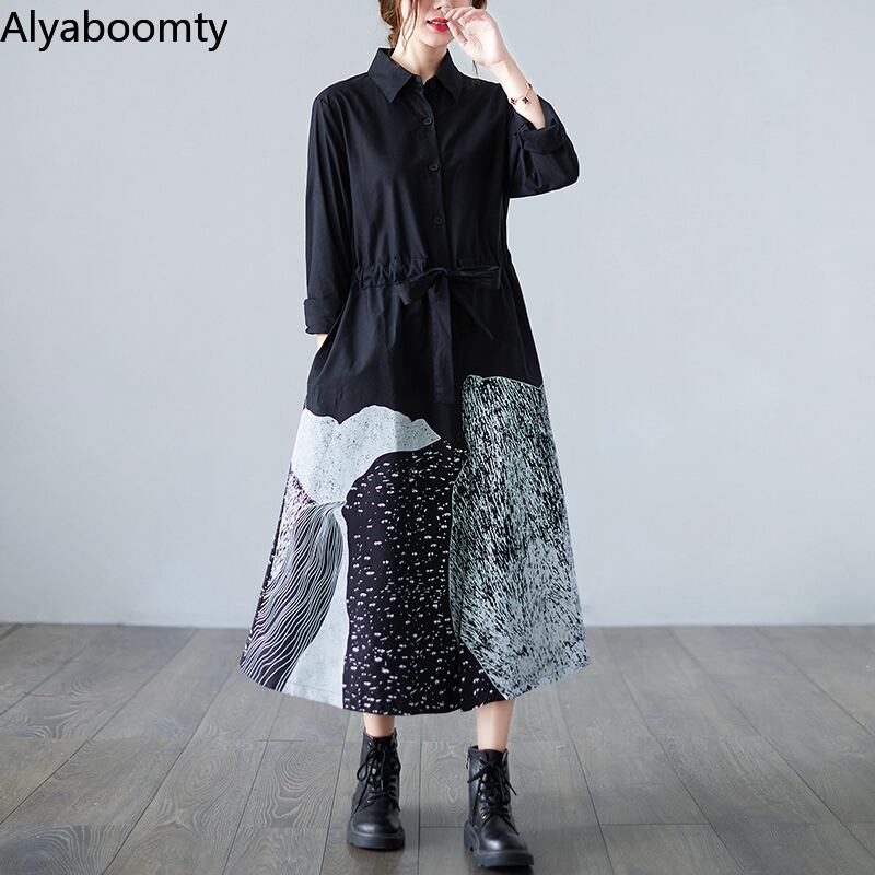 送料無料୨♥୧ オータムスプリングレディースロングシャツ ドレス カラープリントレース長袖スリーブスタンダード レトロ 春物 秋物 レースアップ AOS52381070841