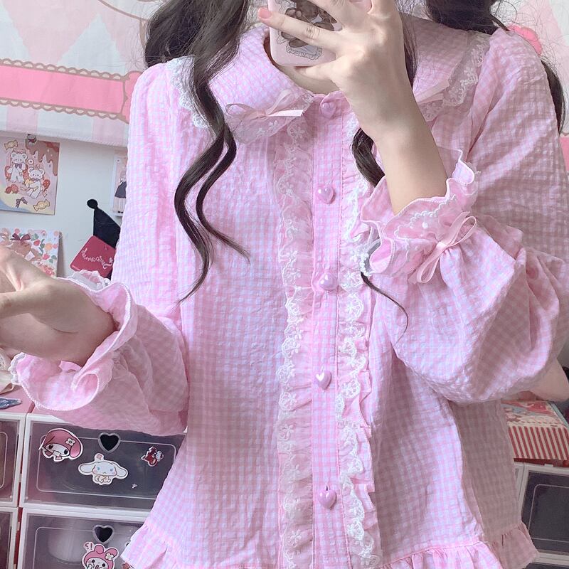 送料無料୨♥୧ スタイルスプリングオータムレディースブラウス ブラックブルーイエローレッドフリルハートシャツ ピンク ラッフル 大人ガーリー スウィート キュート カジュアル 春物 秋物 AOS79099061031