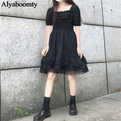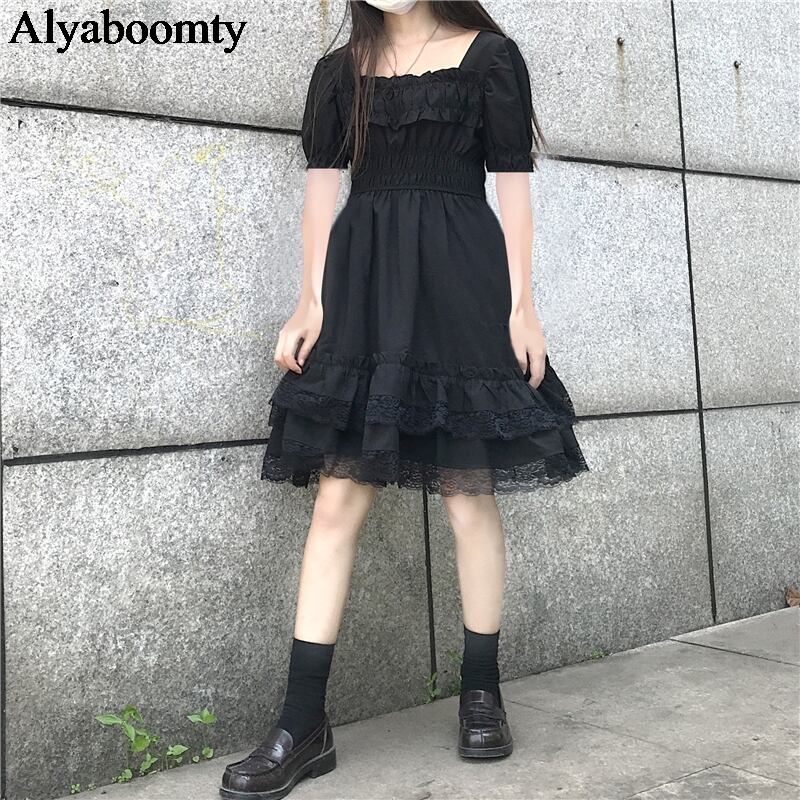 送料無料୨♥୧ サマーレディースブラックミニドレス カラーウェストスリーブレースフリルドレス ワンピース ラッフル かわいい 夏物 スクウェア AOS64225236937