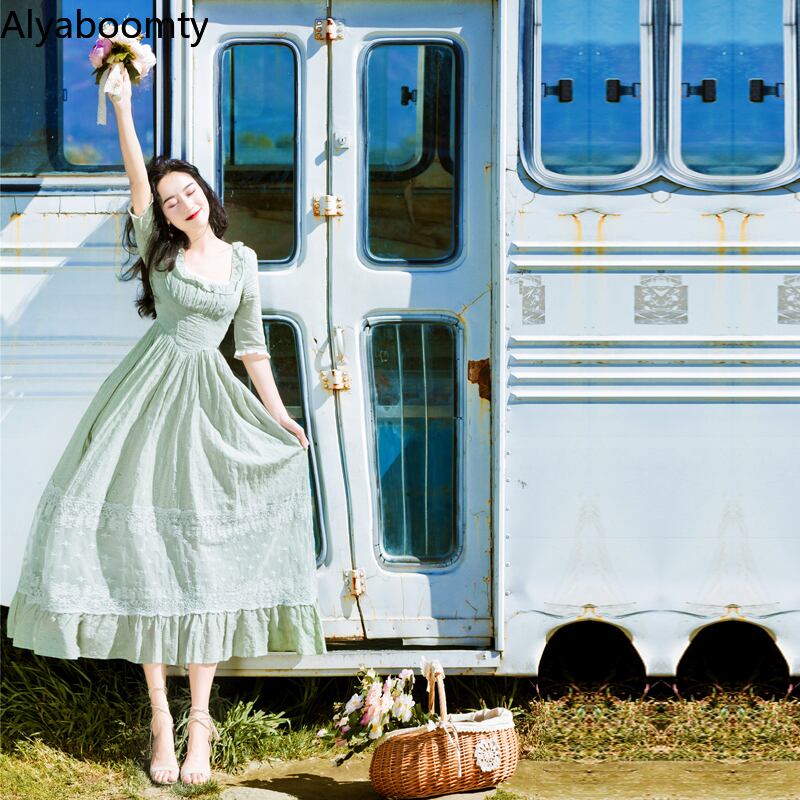 送料無料୨♥୧ サマーレディースマキシロングドレス グリーンフローラル刺繍レース コットン 大人ガーリー スウィート キュート カジュアル 夏物 花柄 AOS72273570738