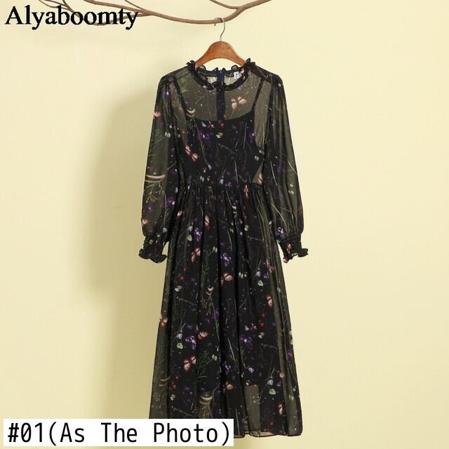 送料無料୨♥୧ スタイルスプリングオータムレディースロングドレス スタンドカラーカラーフローラルプリントシフォン 春物 秋物 花柄 AOS60493412550