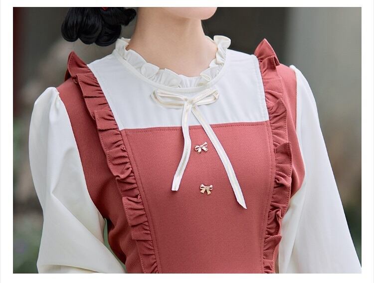 送料無料୨♥୧ スプリングオータムレディースドレス カラーパッチワークリボン長袖スリーブ ロング 大人ガーリー スウィート キュート カジュアル 春物 秋物 AOS18815629771