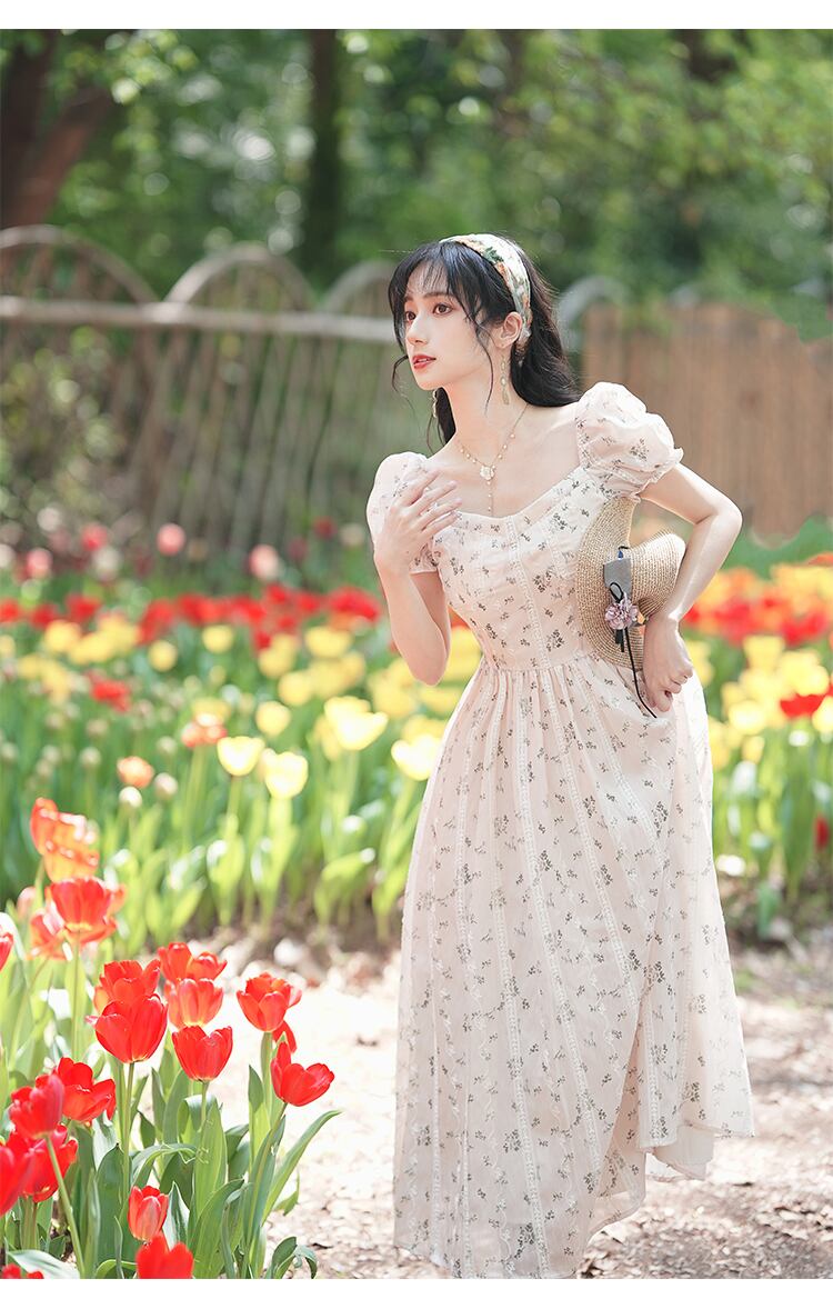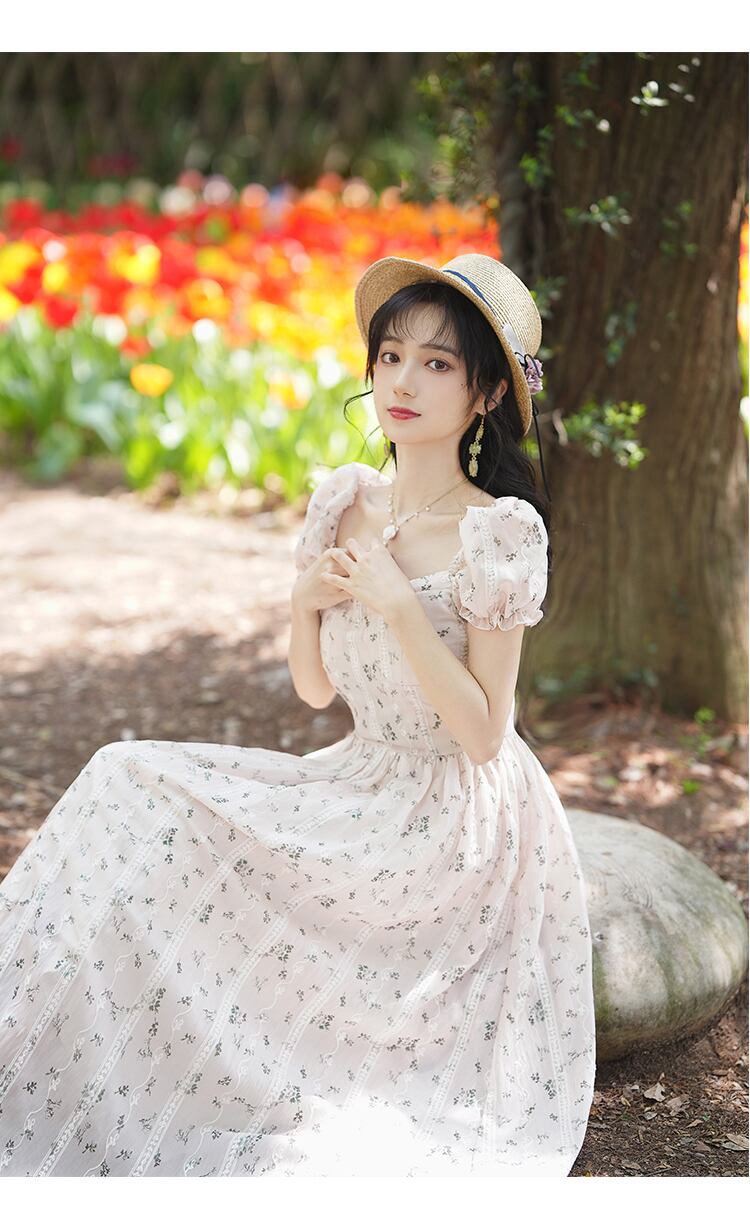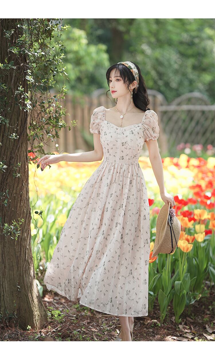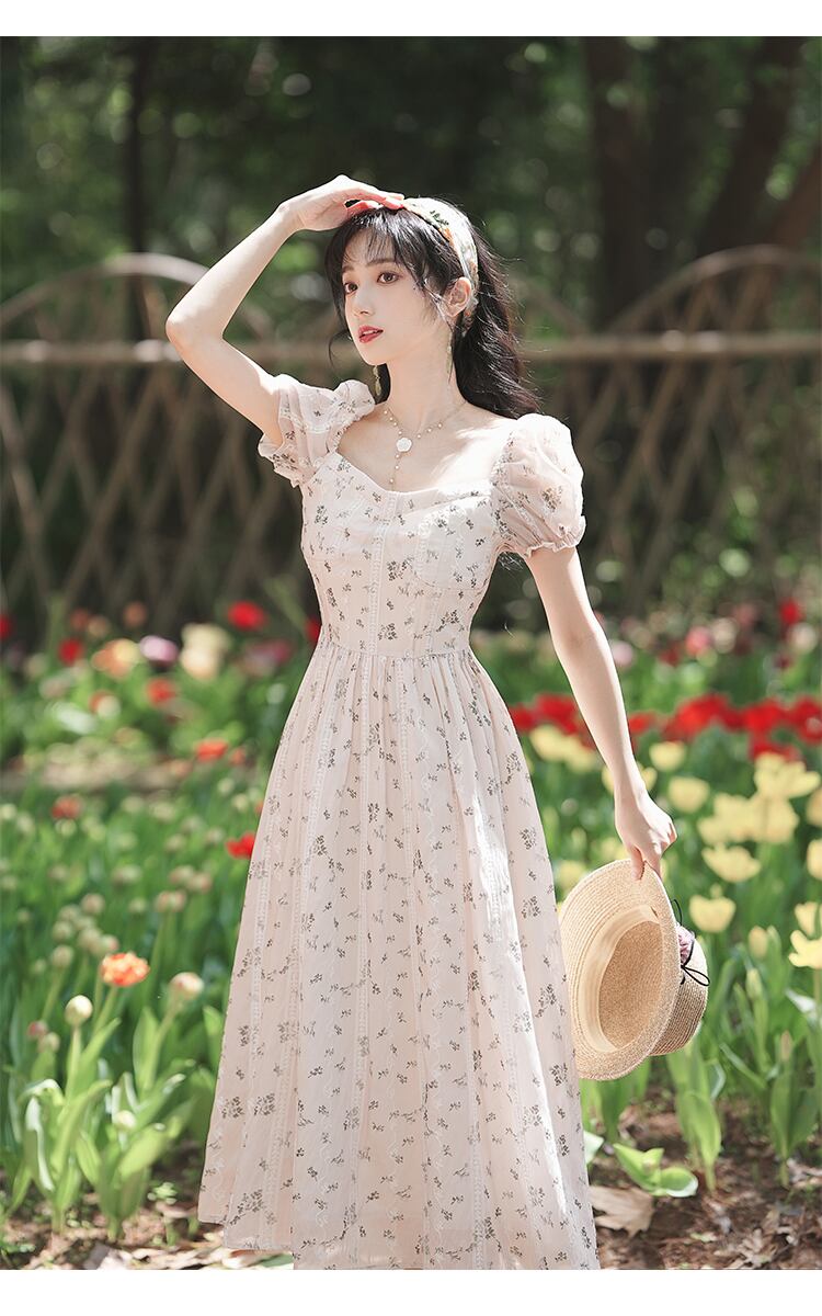送料無料୨♥୧ サマーレディースミディAラインドレス カラーフローラルスリーブ刺繍 大人ガーリー スウィート キュート カジュアル 夏物 花柄 スクウェア AOS99138357264