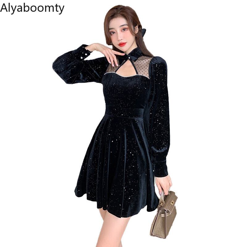 送料無料୨♥୧ スプリングオータムレディースブラックミニドレス メッシュパッチワーク長袖スリーブベルベット ロング 春物 秋物 AOS10650456111