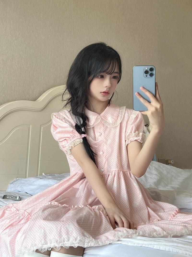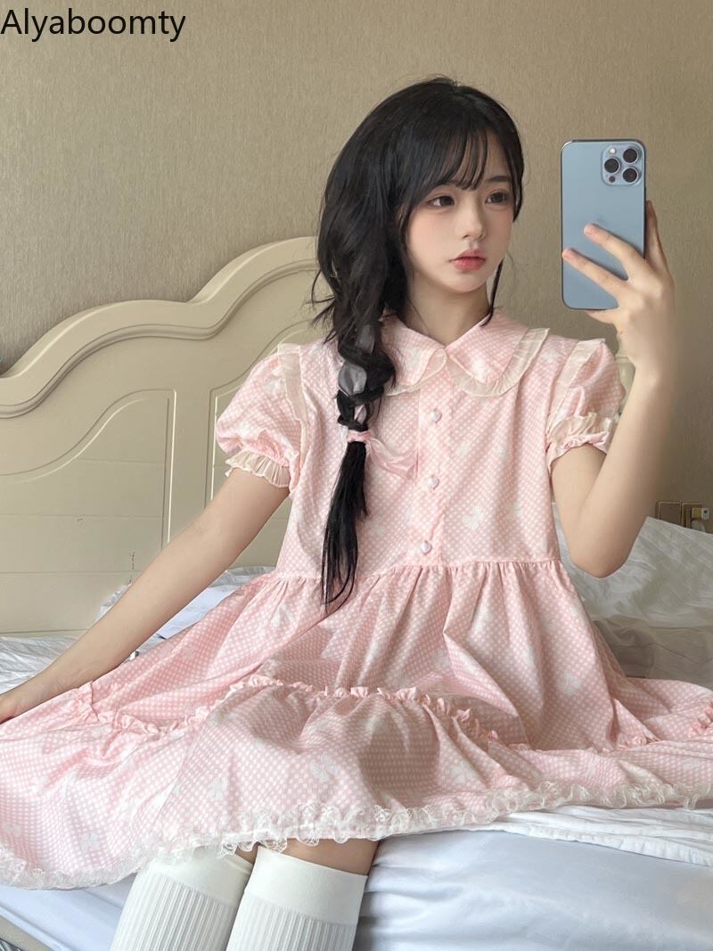 送料無料୨♥୧ スタイルサマーレディースドレス カラーブルーリボンプリント柄スリーブレースフリル ピンク ラッフル 大人ガーリー スウィート キュート カジュアル 夏物 AOS49859702372