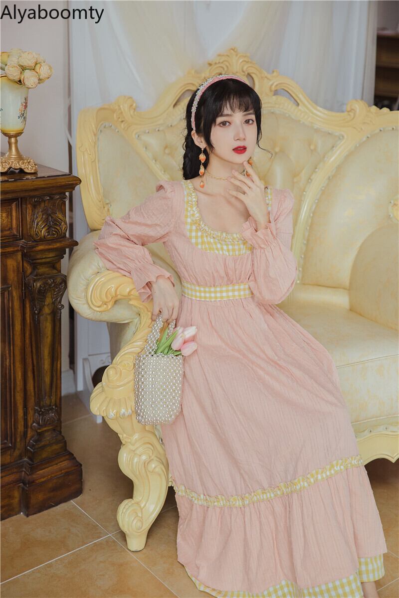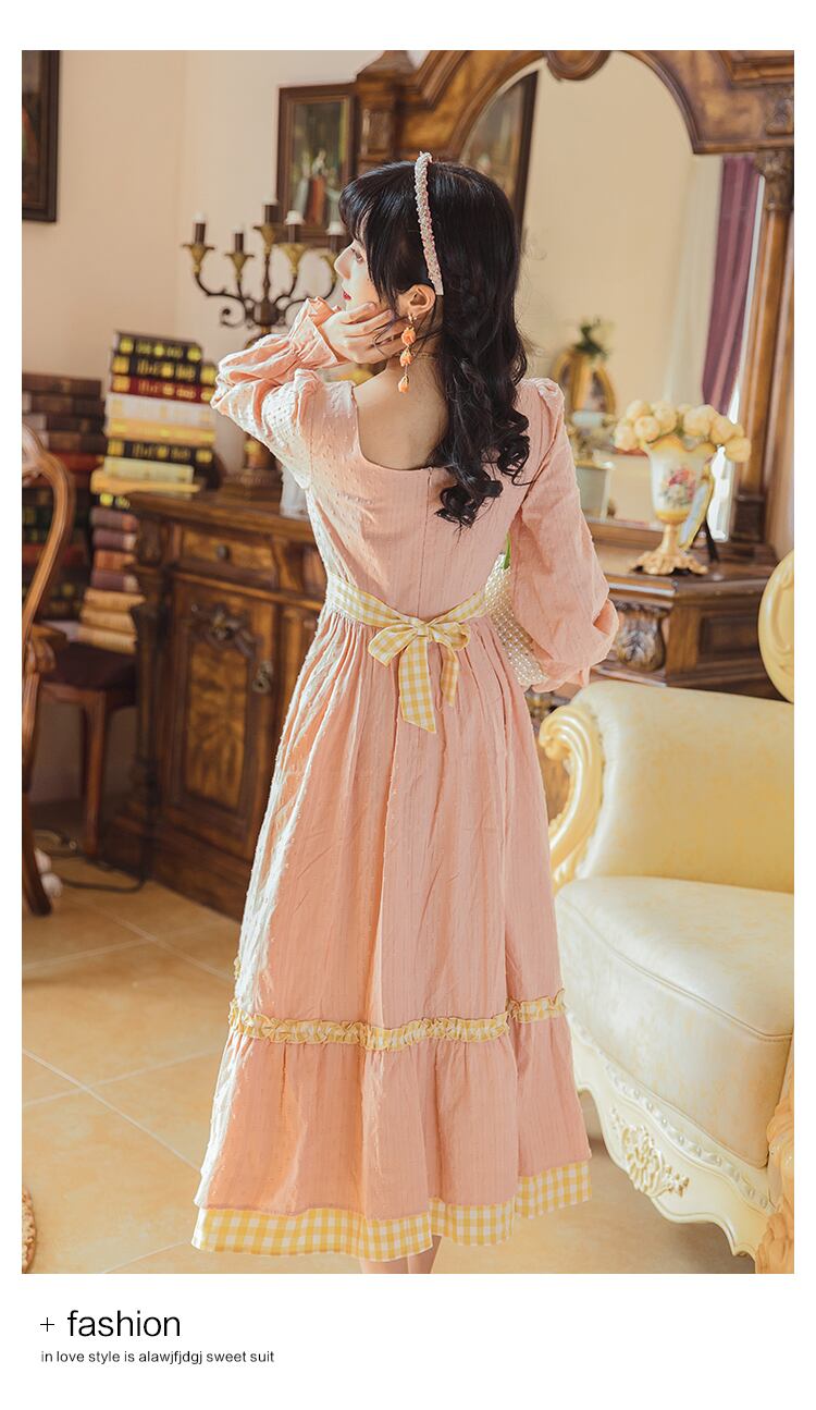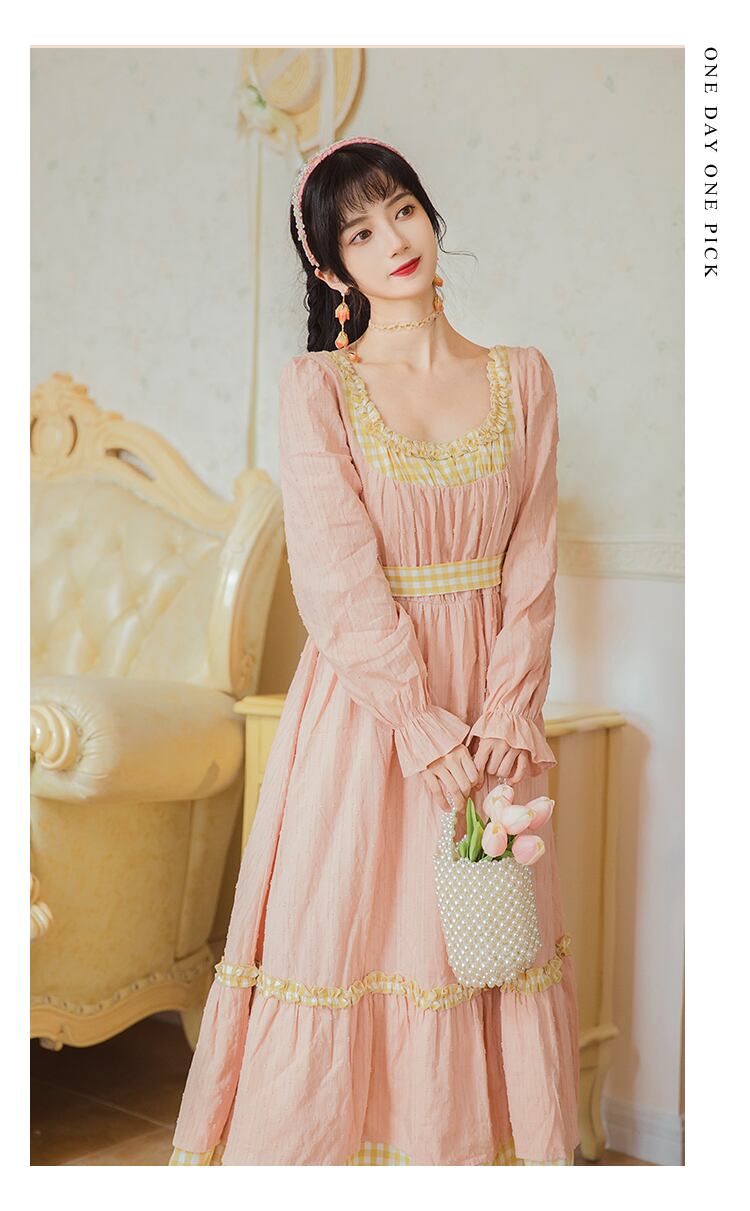 送料無料୨♥୧ スプリングオータムレディースドレス パッチワーク格子柄フリル長袖スリーブヴィンテージドレス ワンピース ロング ピンク ラッフル 大人ガーリー スウィート キュート カジュアル 春物 秋物 ビンテージ AOS87038482780