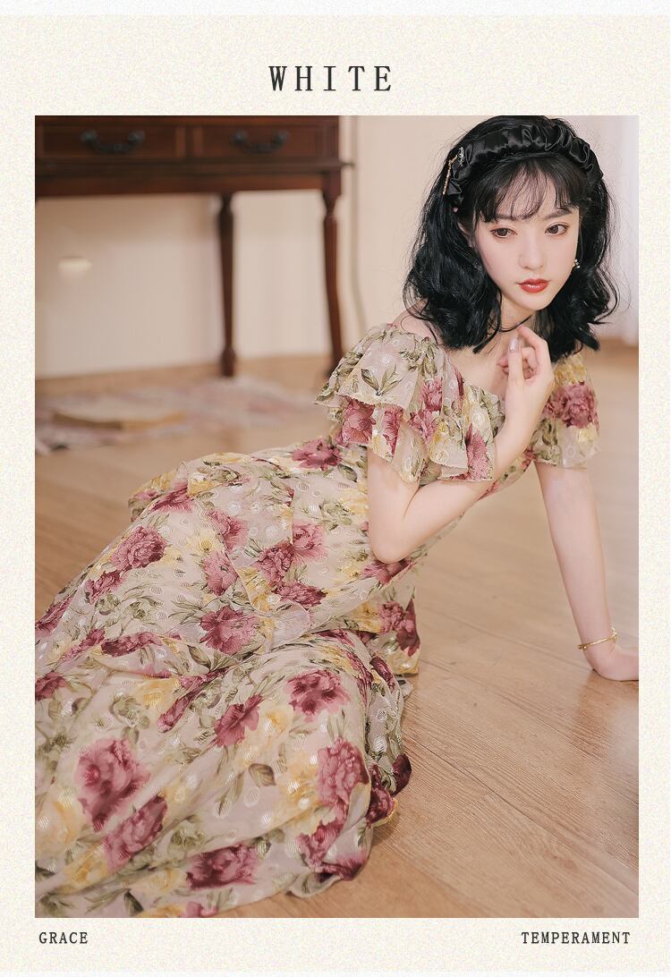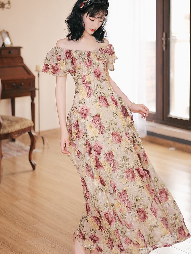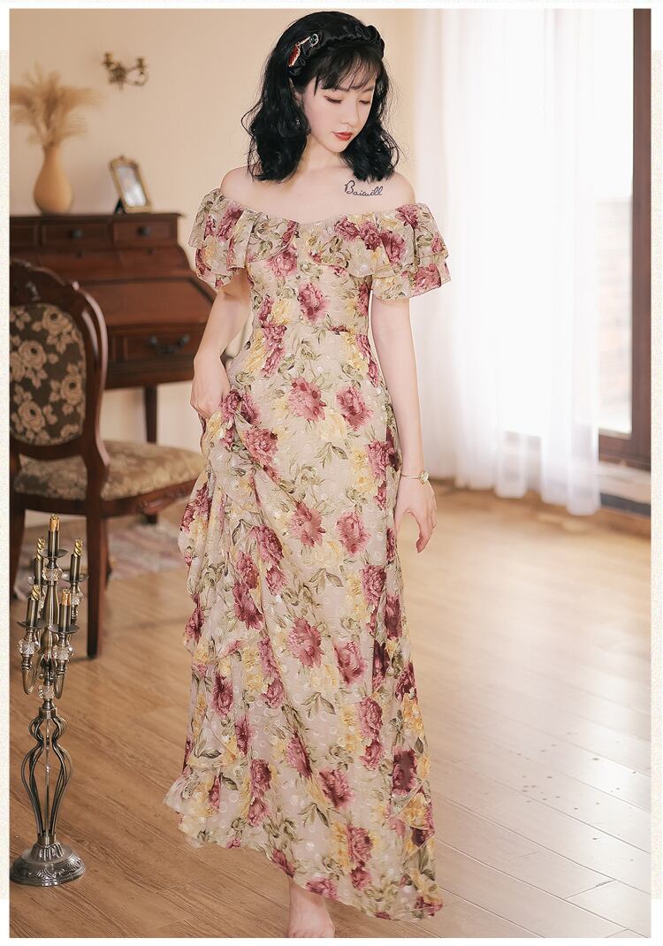 送料無料୨♥୧ レディースマキシドレス フリルフローラルロングスリーブヴィンテージ ラッフル ビーチ 花柄 ビンテージ AOS60214942366