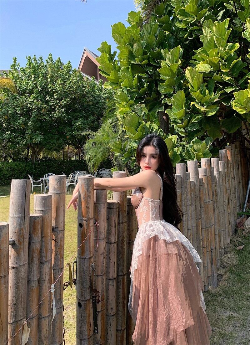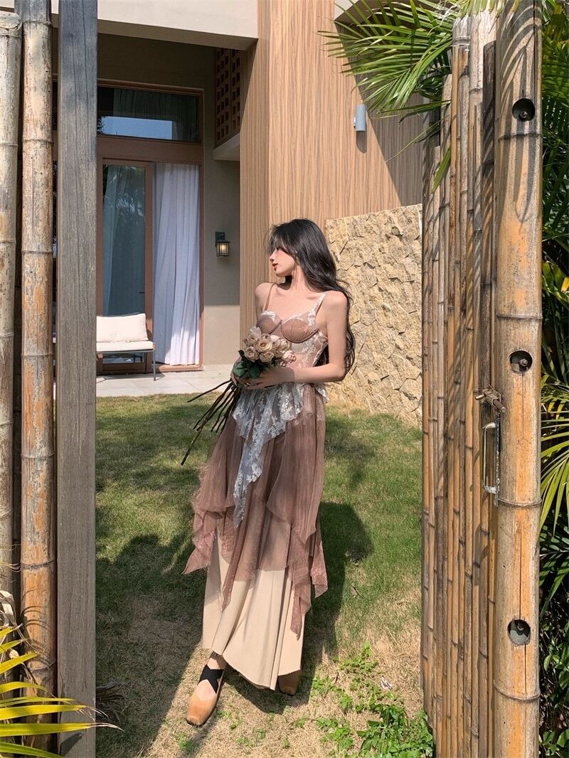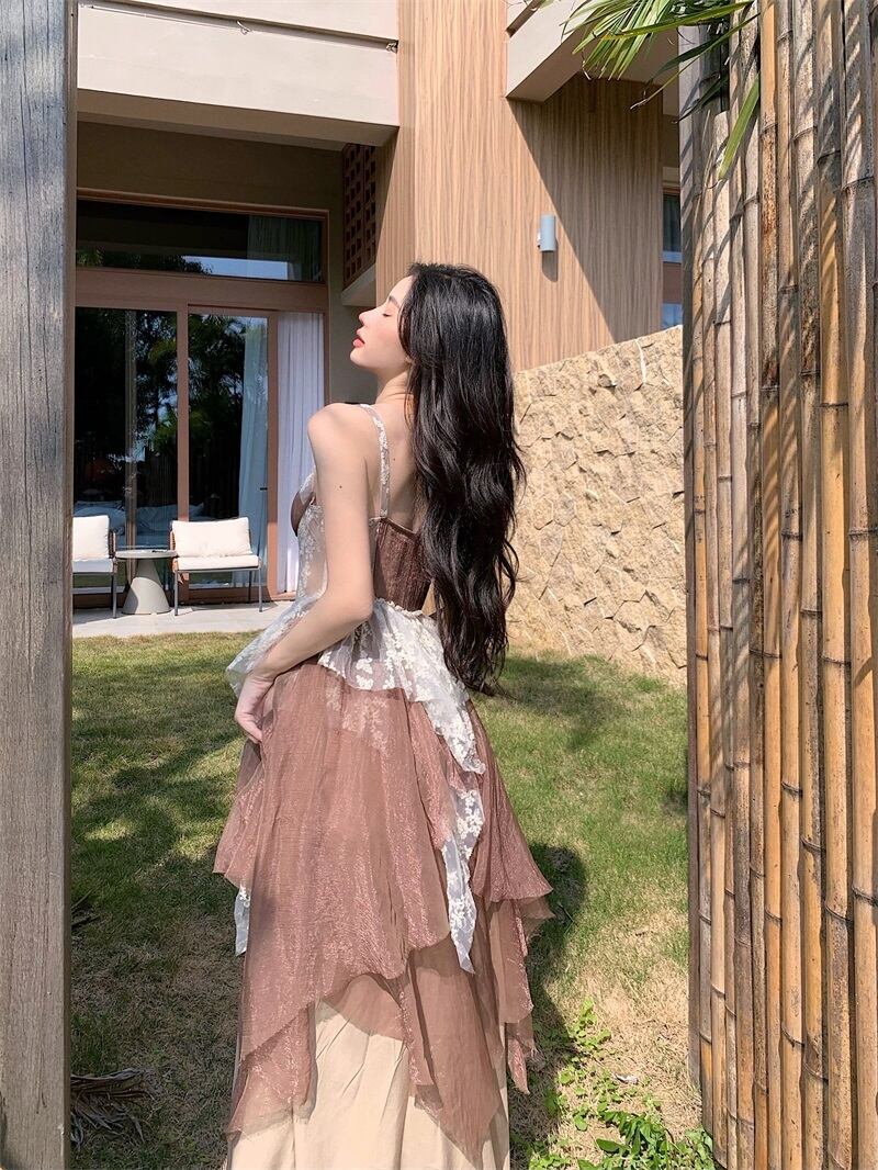 送料無料୨♥୧ サマーレディースロングドレス レースフリルパッチワークバックレスメッシュドレス ワンピース ラッフル 夏物 ビーチ AOS93415356776