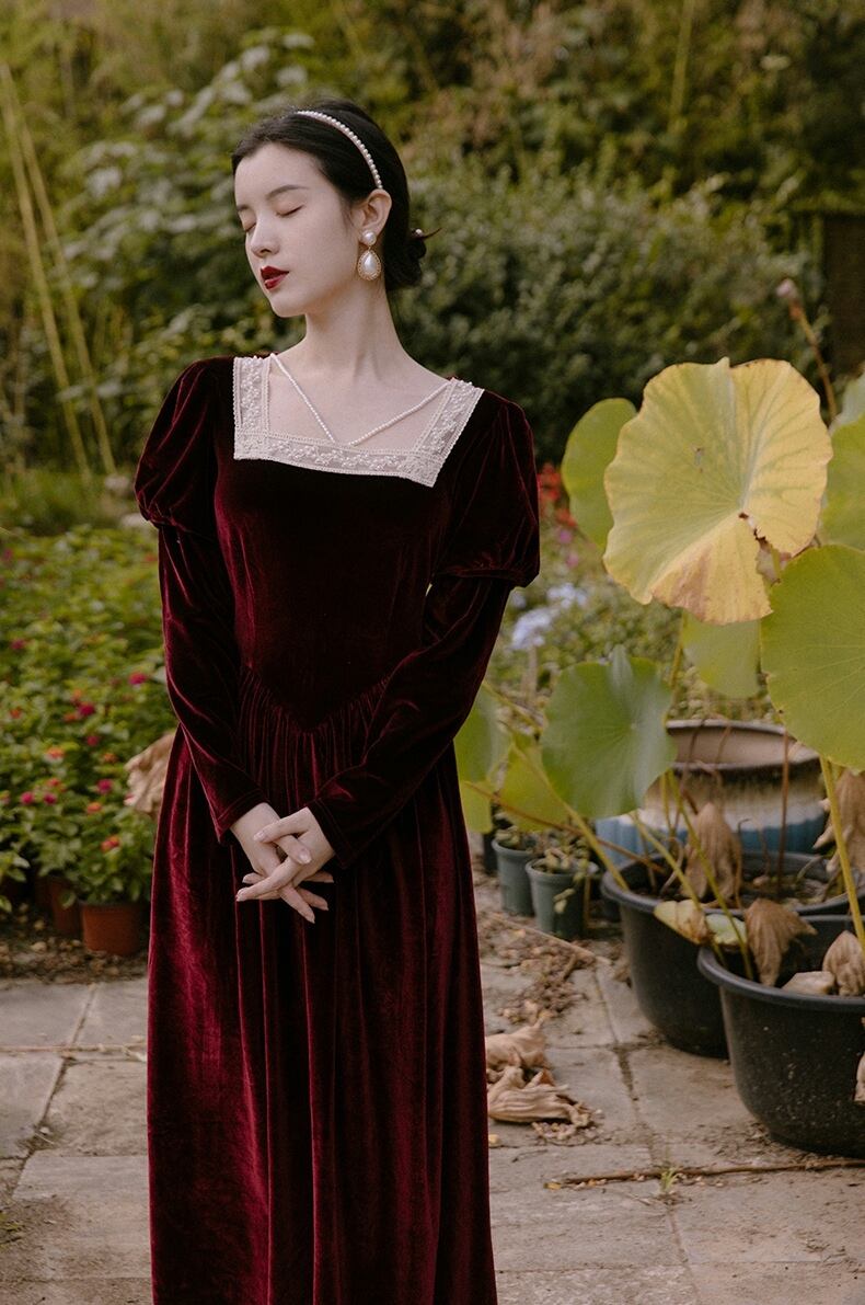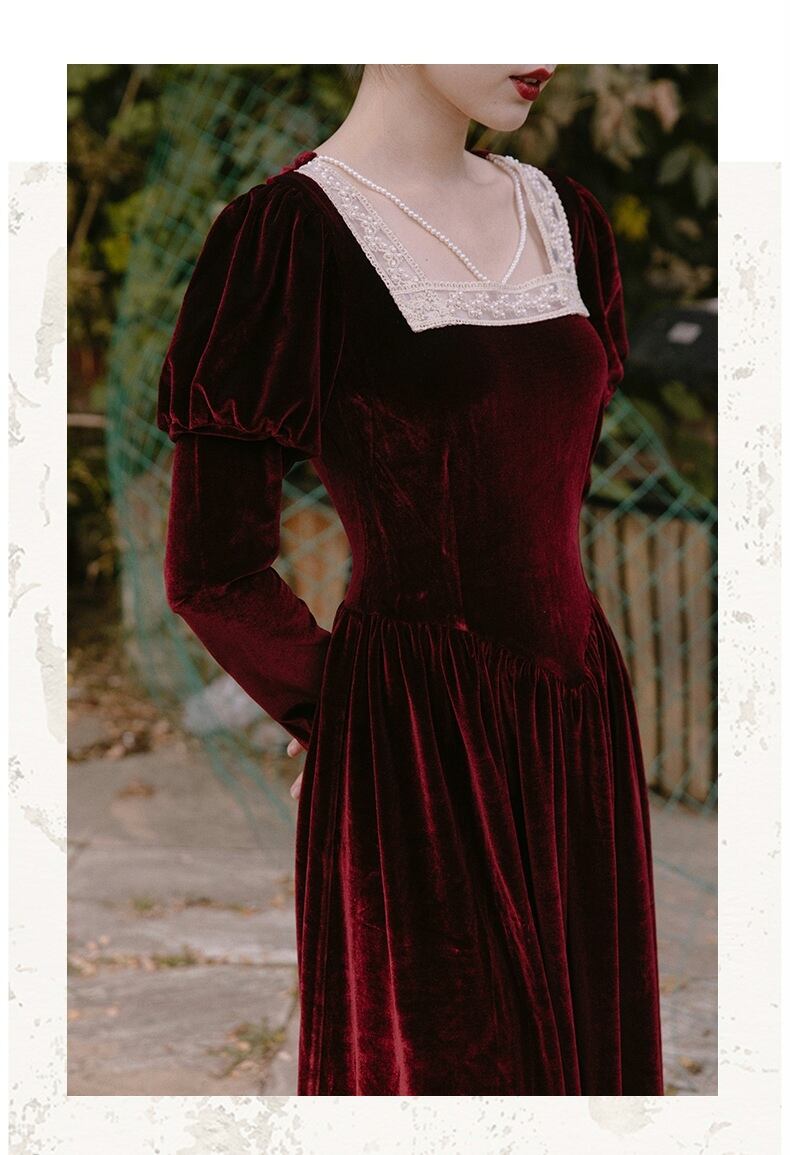 送料無料୨♥୧ スプリングオータムレディースドレス カラーレースレッドヴィンテージスリーブベルベット 春物 秋物 パール 真珠 スクウェア ビンテージ AOS14735047971