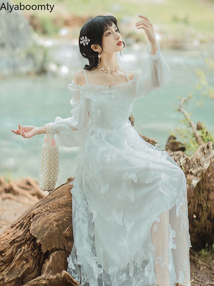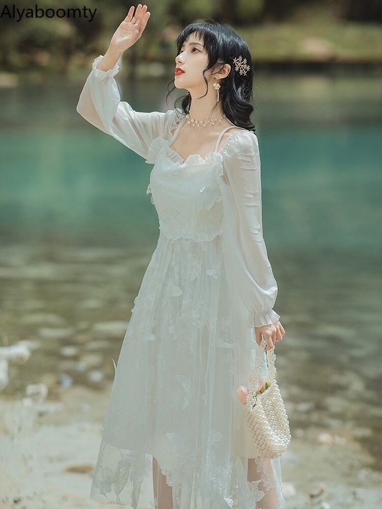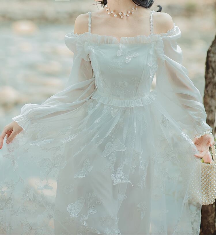 送料無料୨♥୧ スプリングオータムレディースミディドレス パールButterflyデザイン ロング 春物 秋物 真珠 AOS1663139049
