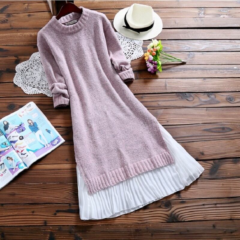 送料無料୨♥୧ スプリングオータムレディースミディドレス ラウンドネックニットシフォンパッチワークセーター 長袖スリーブドレス ワンピース ロング 春物 秋物 Oネック AOS80099586541