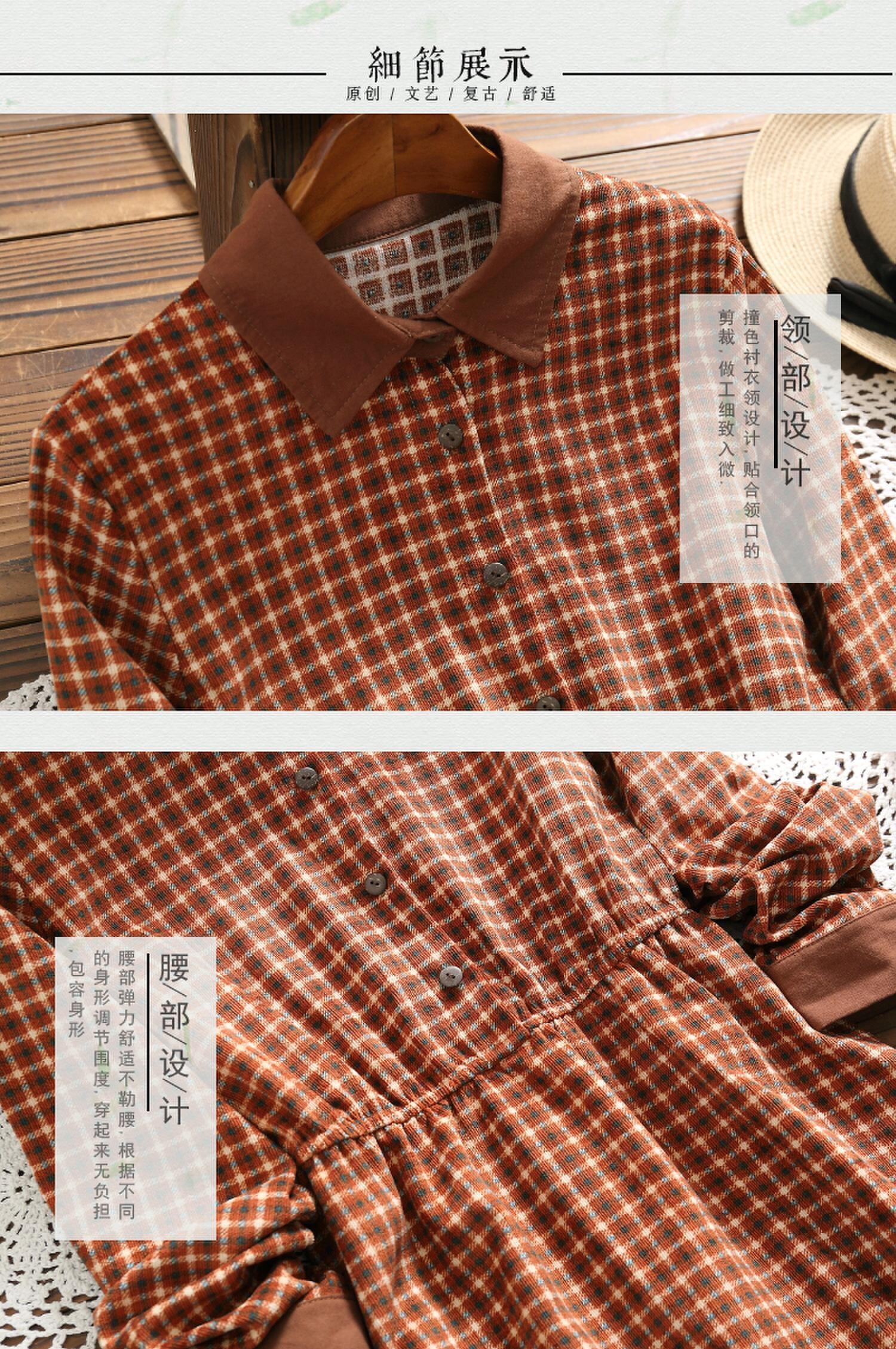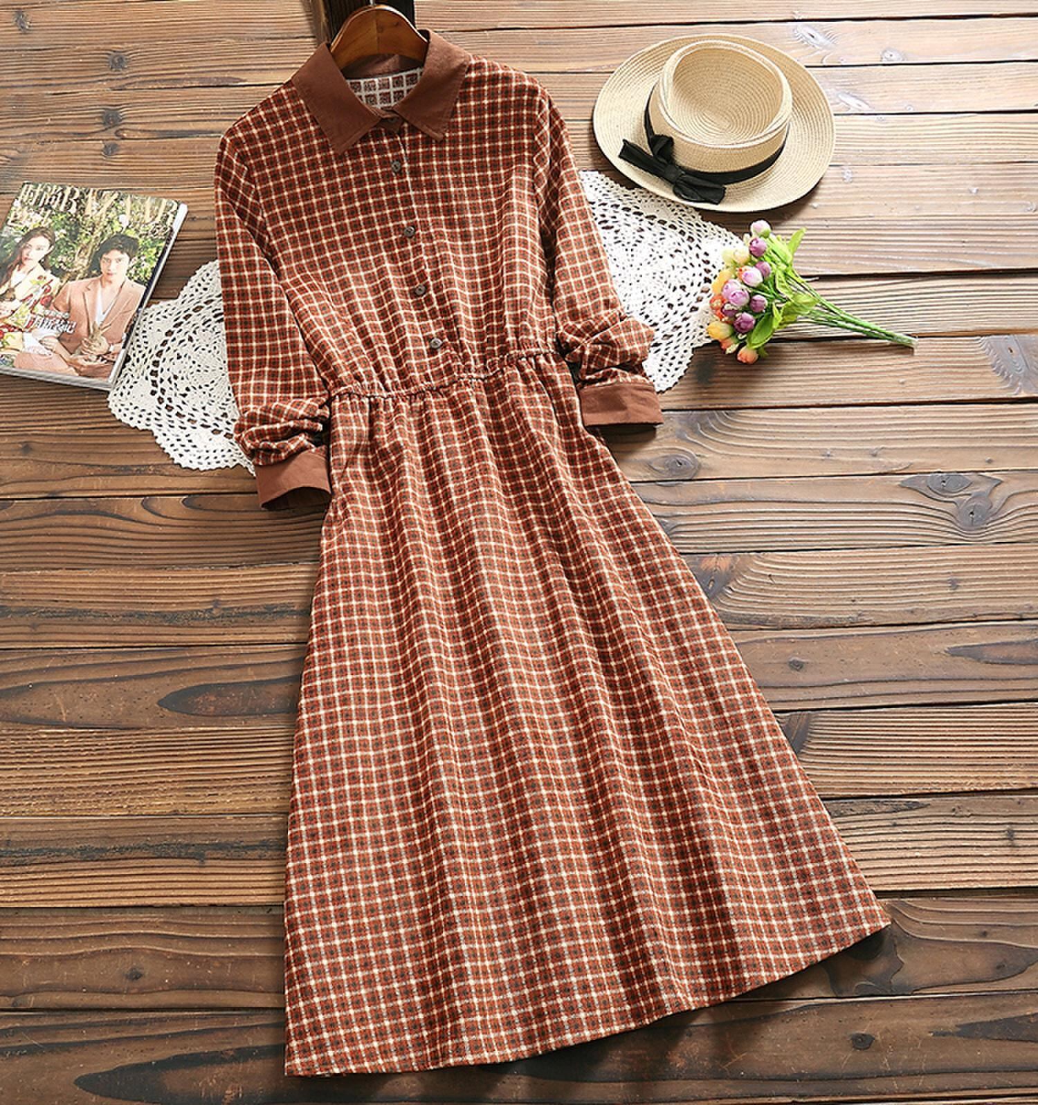送料無料୨♥୧ スプリングオータムレディースコーデュロイドレス カラー格子柄長袖スリーブ ロング エラスティック 伸縮 春物 秋物 AOS76960348577