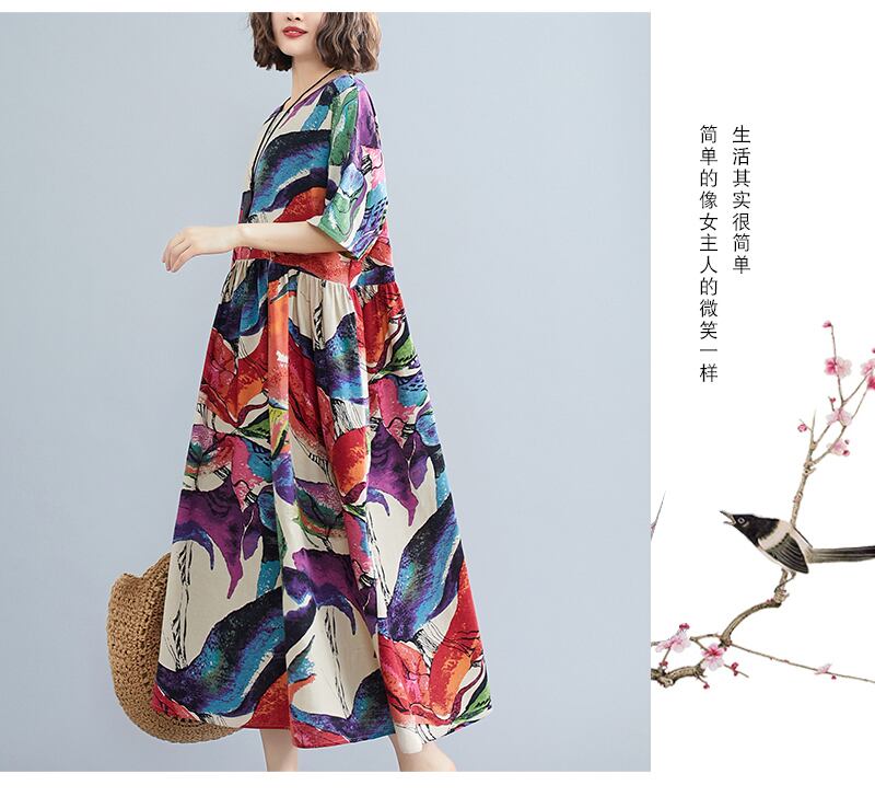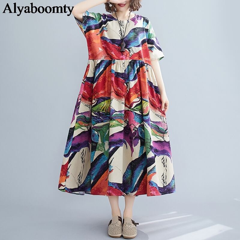 送料無料୨♥୧ サマーレディースロングドレス カラープリントヴィンテージルーズ コットン 夏物 Oネック ビンテージ AOS43479674288
