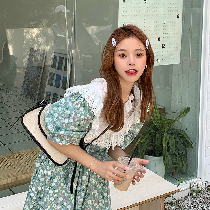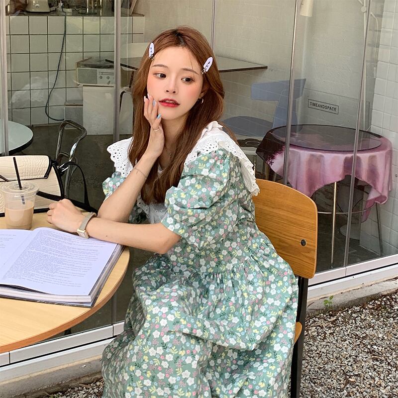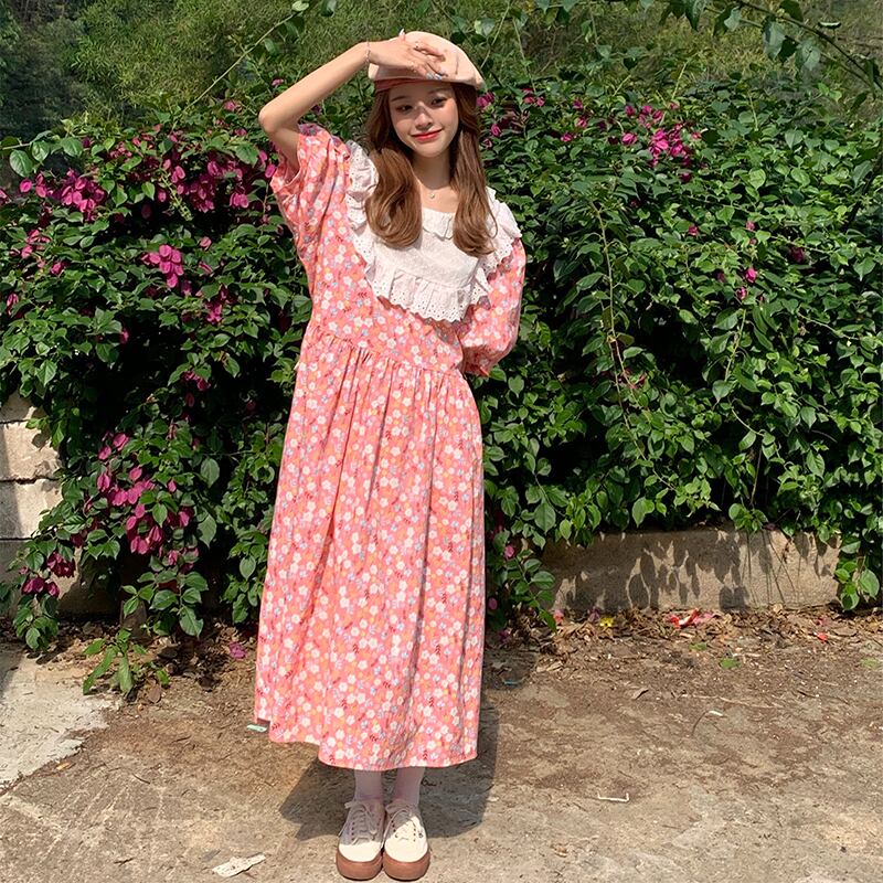 送料無料୨♥୧ サマーレディースルーズミディドレス レースカラーグリーンスリーブフローラルプリント ピンク 大人ガーリー スウィート キュート カジュアル 夏物 花柄 AOS1881319197