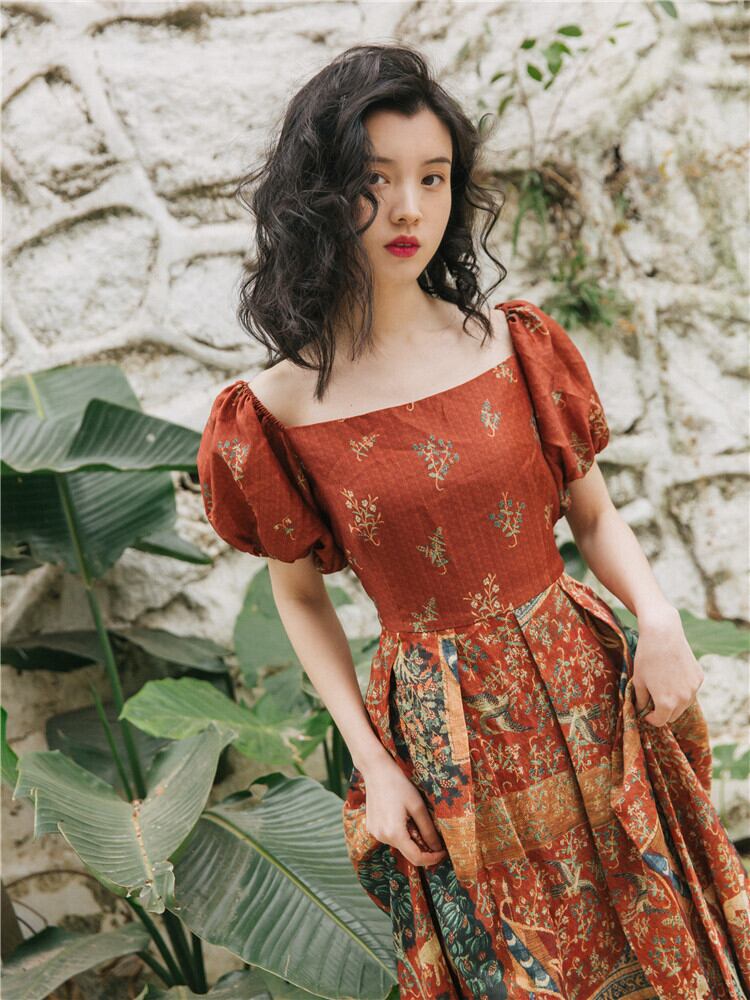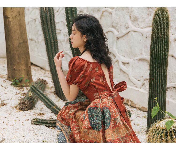 送料無料୨♥୧ サマーレディースロングエスニックスタイルドレス カラーバックレスヴィンテージスリーブミディ 夏物 スクウェア ビンテージ AOS87936424720