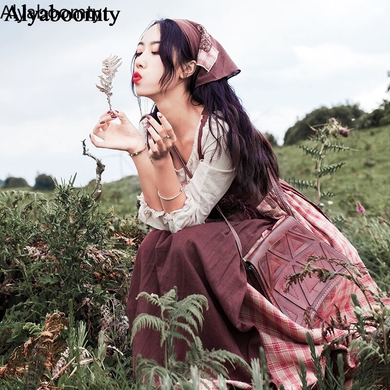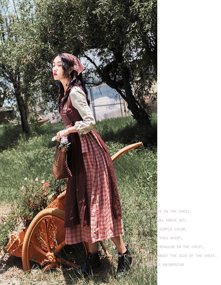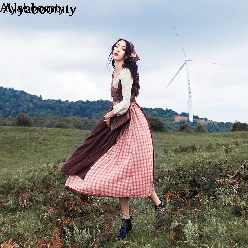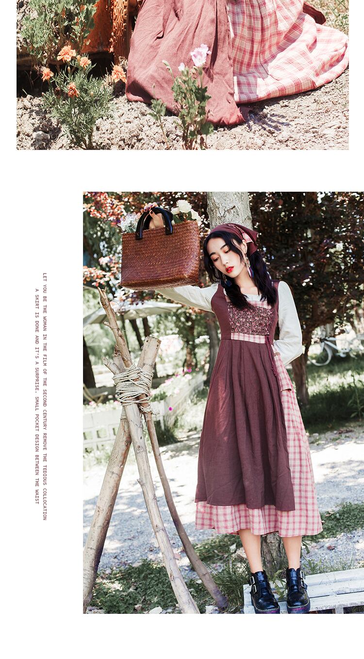 送料無料୨♥୧ オータムスプリングレディースロングドレス 格子柄フローラルバンドヴィンテージ コットン 大人ガーリー スウィート キュート カジュアル 春物 秋物 花柄 ビンテージ AOS84941541418