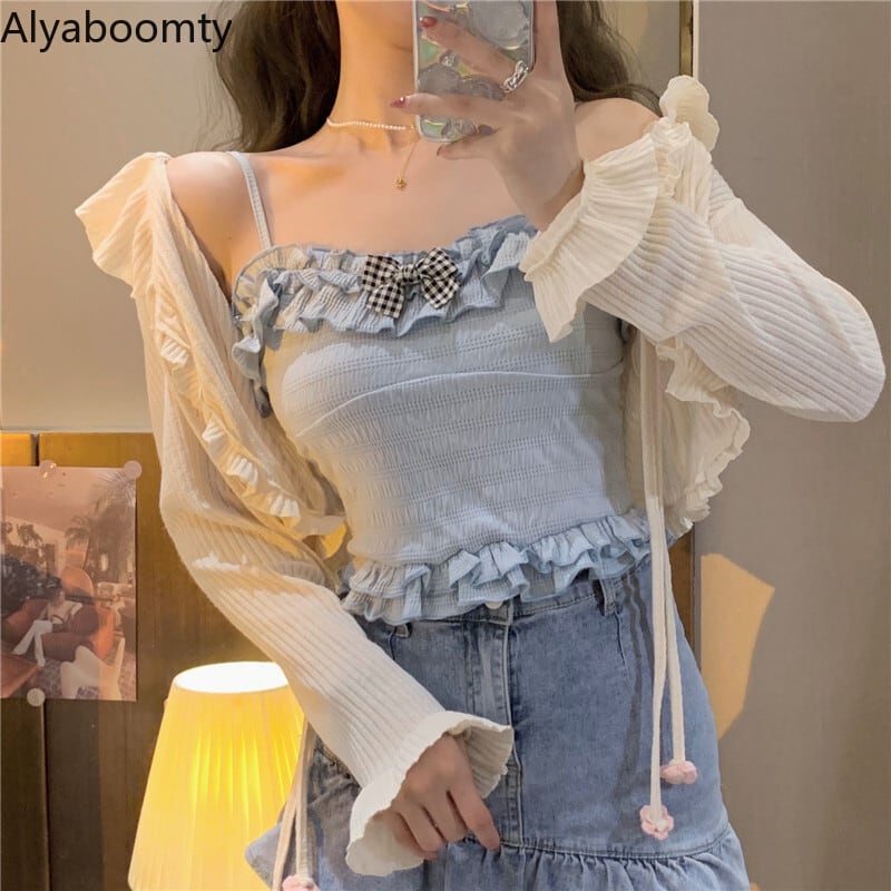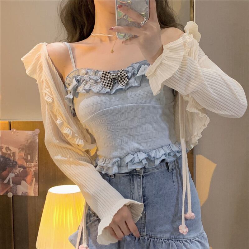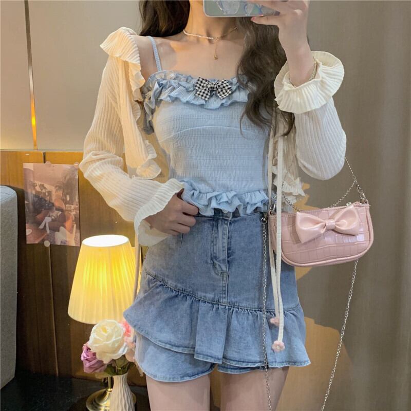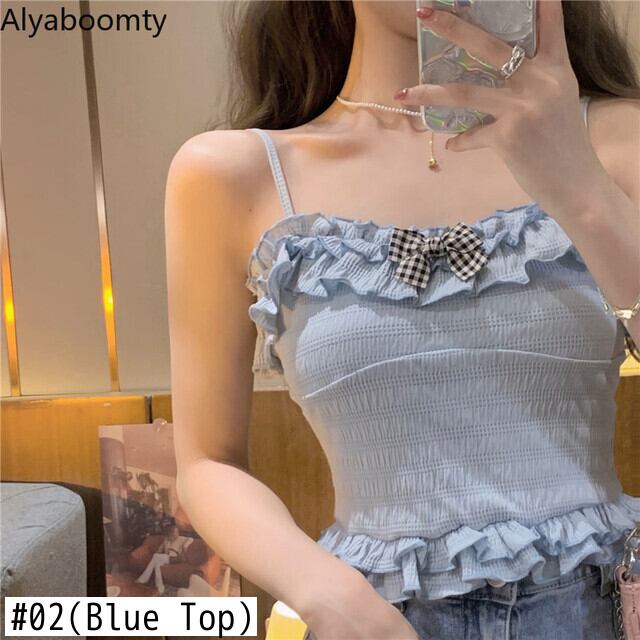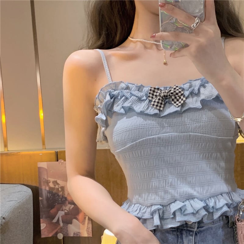 送料無料୨♥୧ サマーレディースクロップトップ トップス ブルーベージュリボンフリルキャミスリムショートタンクトップ ラッフル 大人ガーリー スウィート キュート カジュアル 夏物 AOS53618533755
