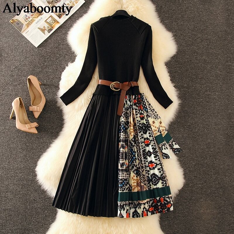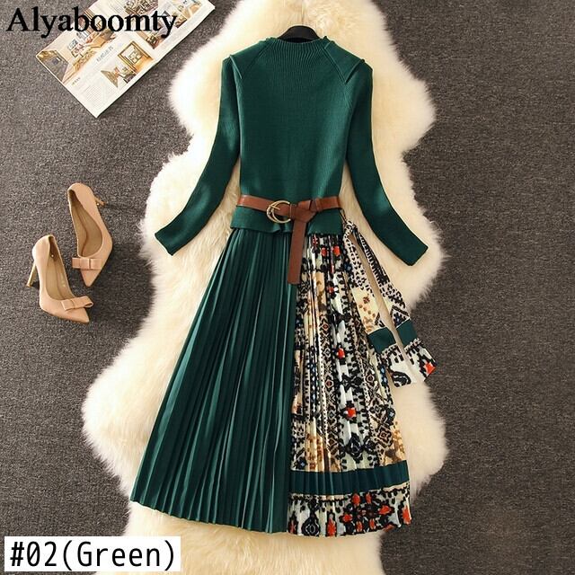 送料無料୨♥୧ ウィンターレディースセーター ドレス ブラックネイビーグリーンパッチワークボヘミアンプリーツミディニット 冬物 AOS48282828047