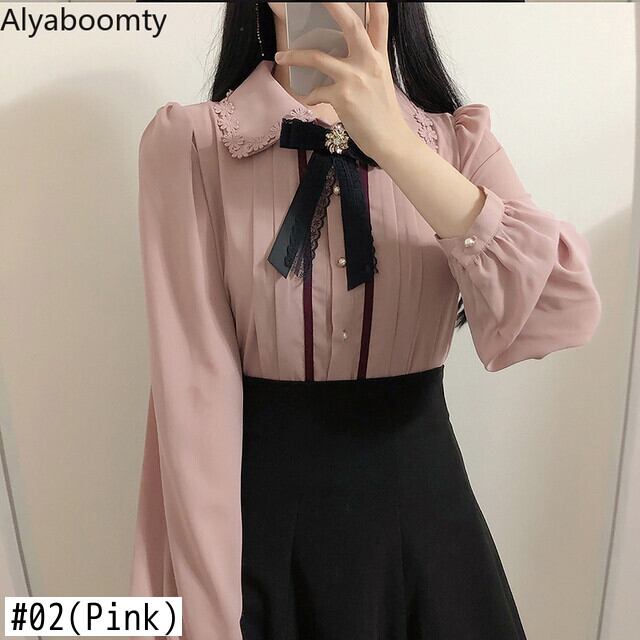 送料無料୨♥୧ スプリングオータムレディースシャツ カラーベージュフローラルリボンブラウス ピンク 大人ガーリー スウィート キュート カジュアル 春物 秋物 花柄 会社 学校 通勤や通学にも AOS62859777382