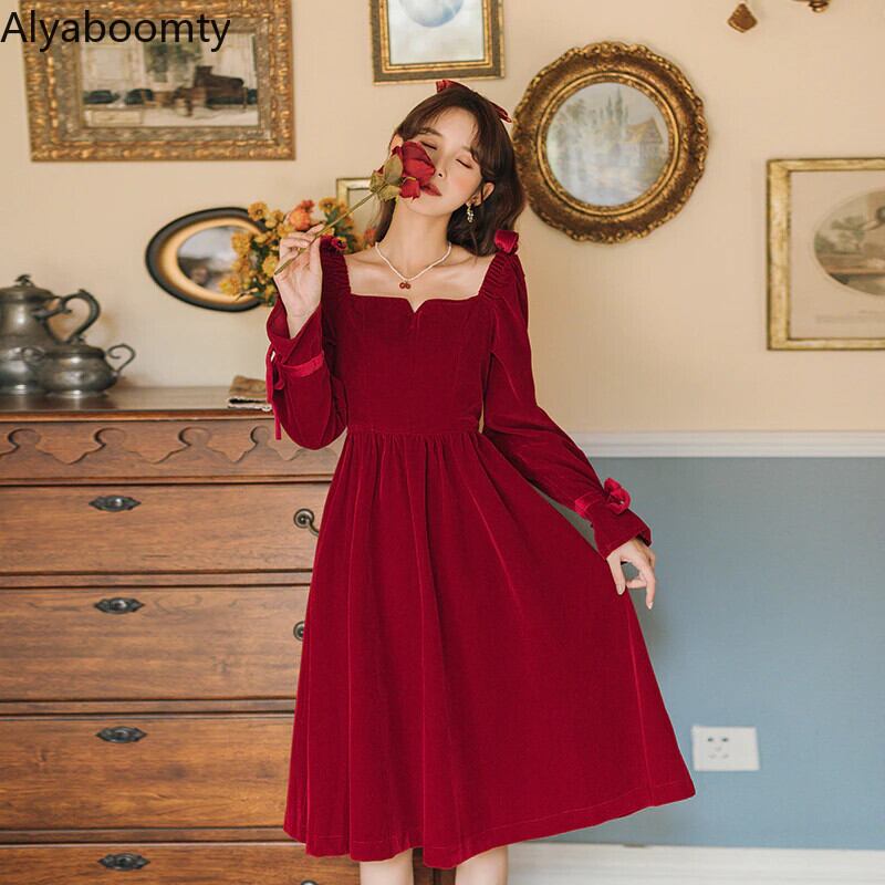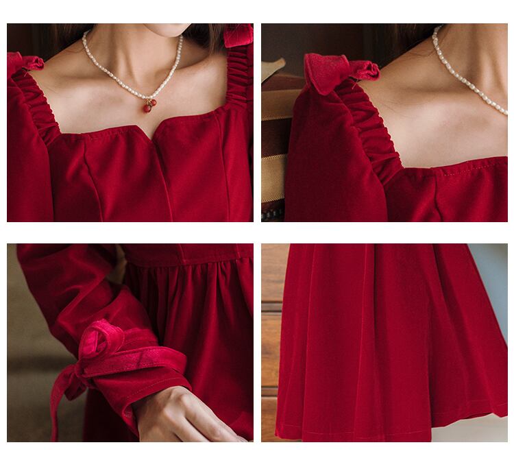送料無料୨♥୧ スプリングオータムレディースレッドドレス カラーソリッド スリムヴィンテージリボン長袖スリーブベルベットドレス ワンピース ロング 大人ガーリー スウィート キュート カジュアル 春物 秋物 ソリッドカラー スクウェア ビンテージ AOS93834887338