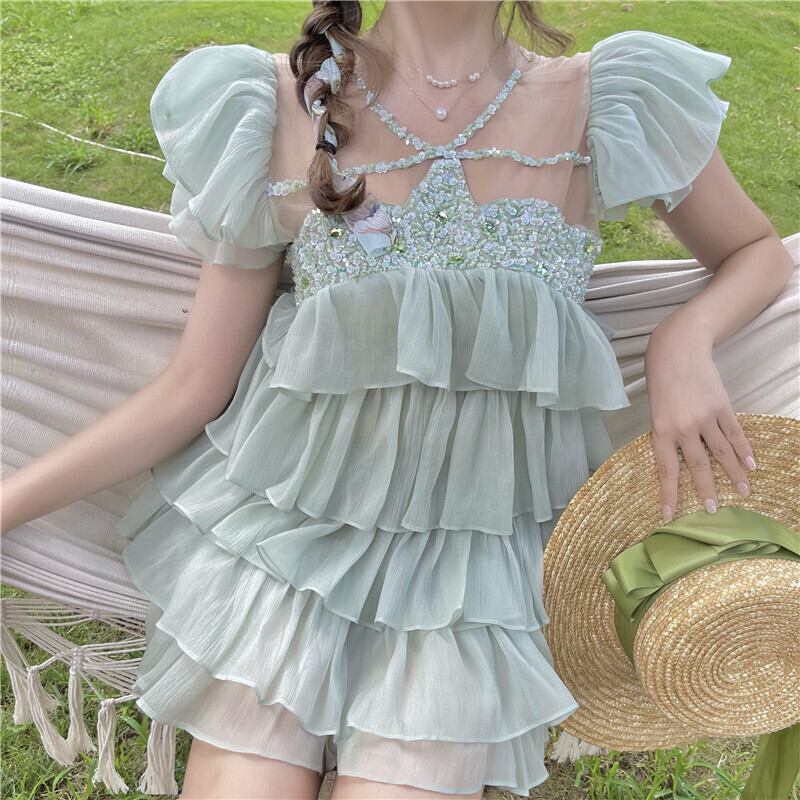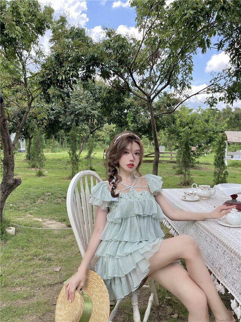 送料無料୨♥୧ サマーレディースミニドレス グリーンフリルガウン レッド ラッフル 大人ガーリー スウィート キュート カジュアル 夏物 AOS5181055408