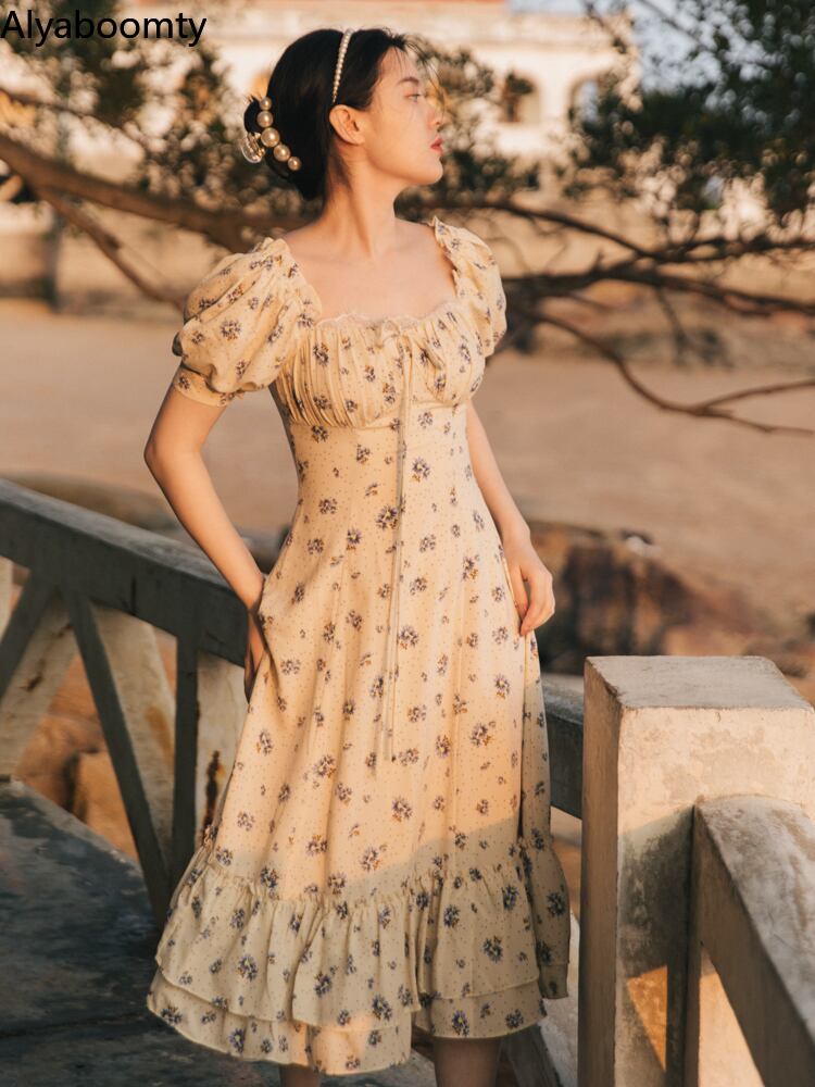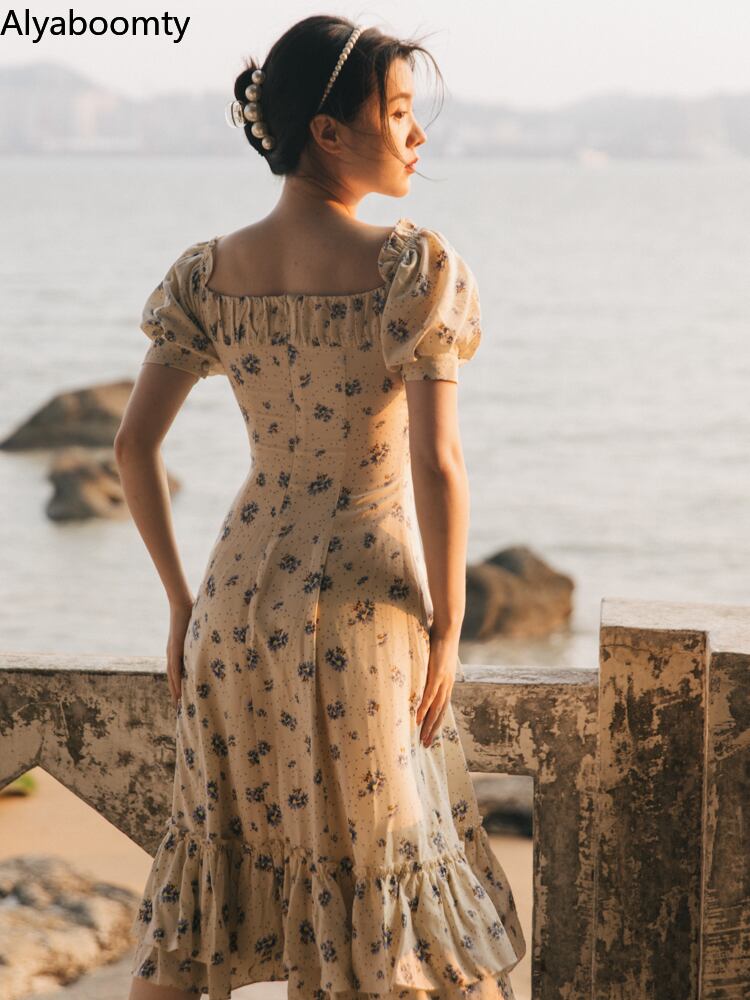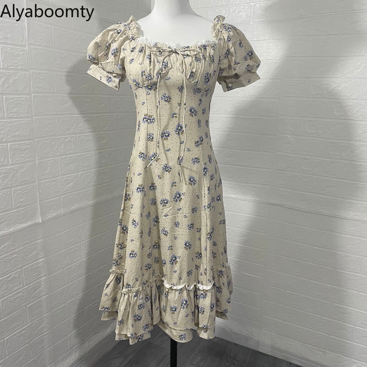 送料無料୨♥୧ サマーレディーススタイルミディドレス カラーフローラルバンドスリーブフリル ラッフル 大人ガーリー スウィート キュート カジュアル 夏物 花柄 スクウェア AOS7920644356