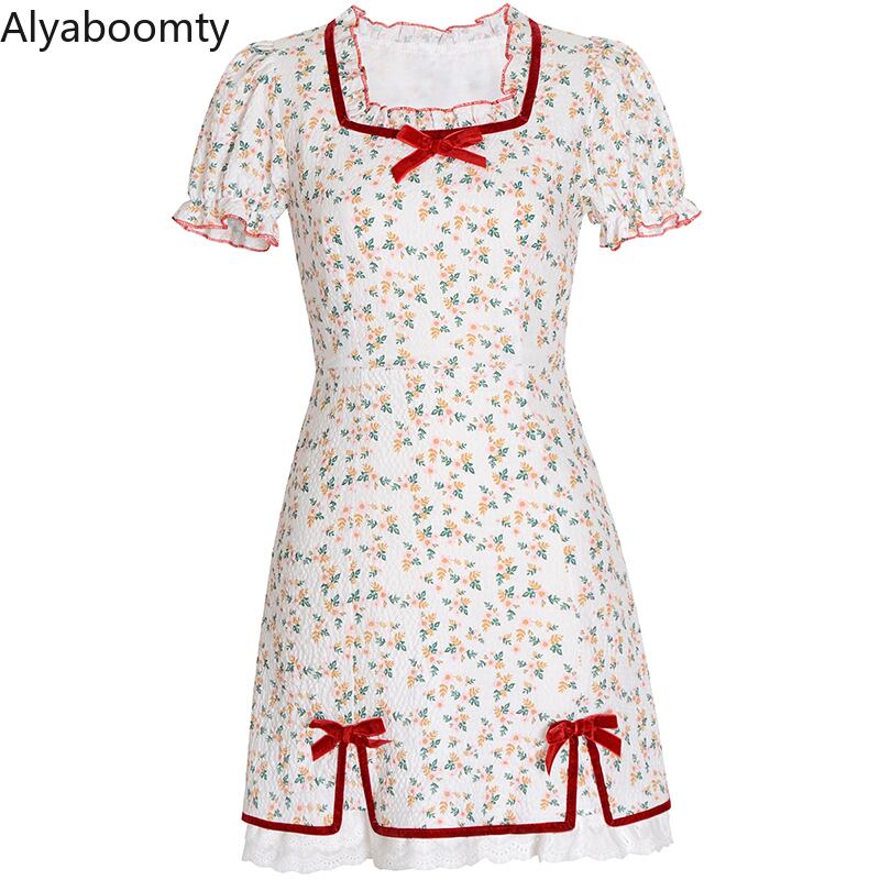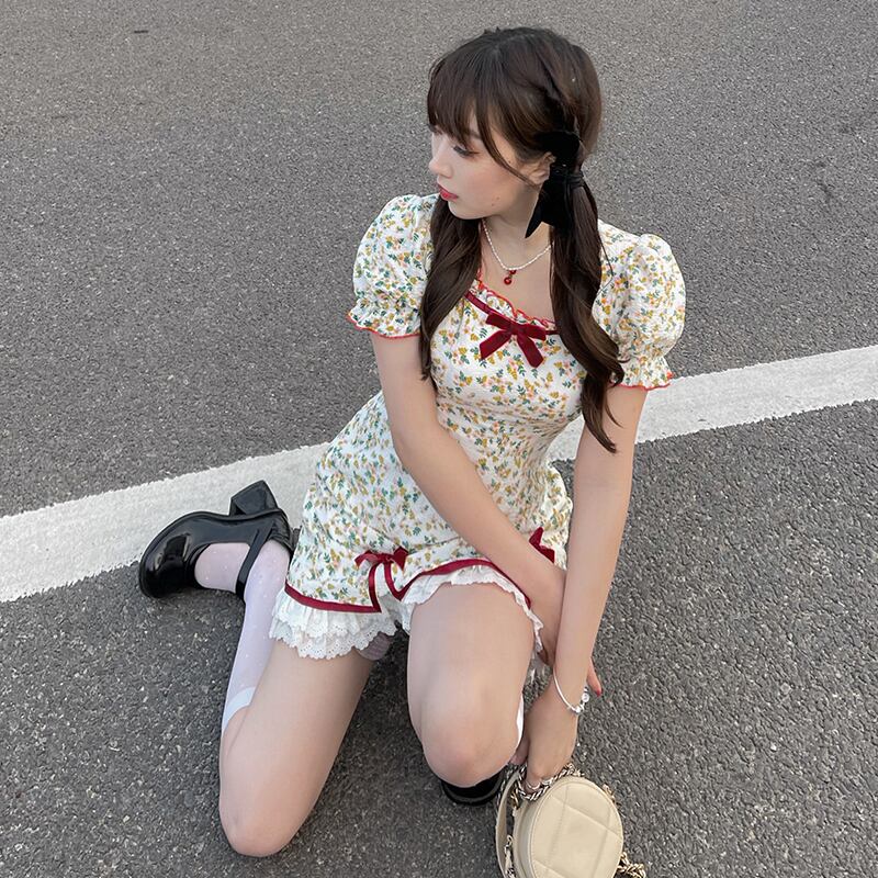 送料無料୨♥୧ サマーレディースドレス カラーフローラルプリントリボンスリーブレースフリルミニ ラッフル 夏物 花柄 スクウェア AOS72424984157