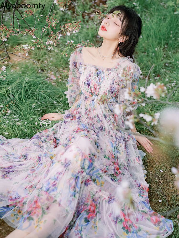 送料無料୨♥୧ サマーレディースマキシドレス フローラルプリントメッシュフリルロングドレス ワンピース レッド ラッフル 大人ガーリー スウィート キュート カジュアル 夏物 花柄 AOS52103912946