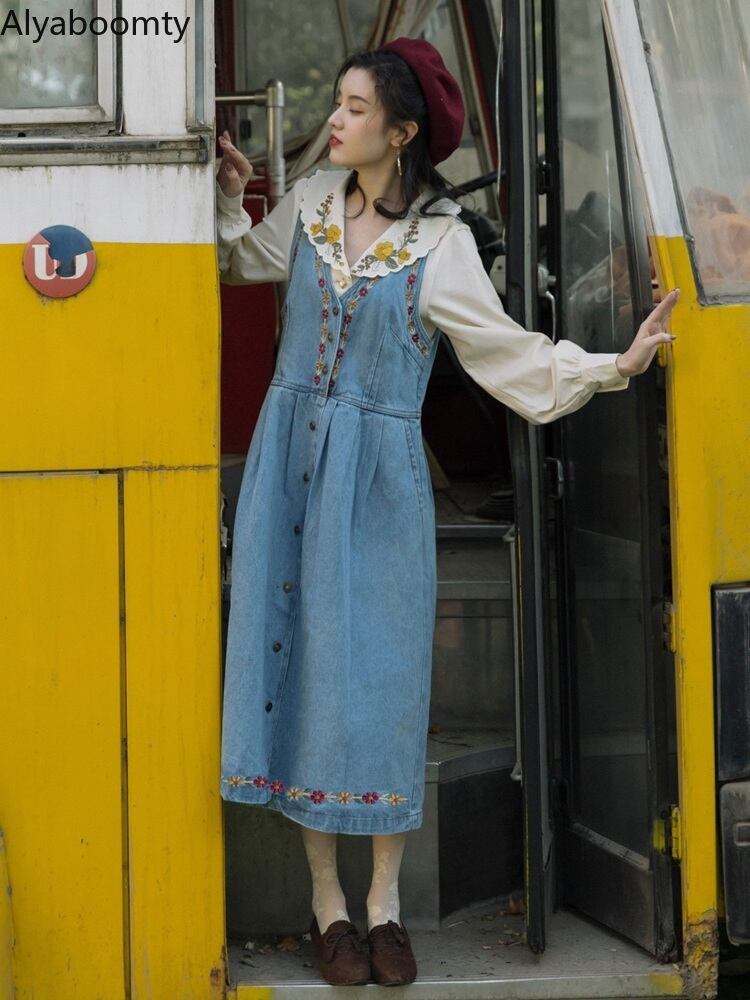 送料無料୨♥୧ スタイルスプリングオータムレディースセット 刺繍ロングヴィンテージ ブルー ブラウス 春物 秋物 ビンテージ ヨーロピアン AOS28077986009