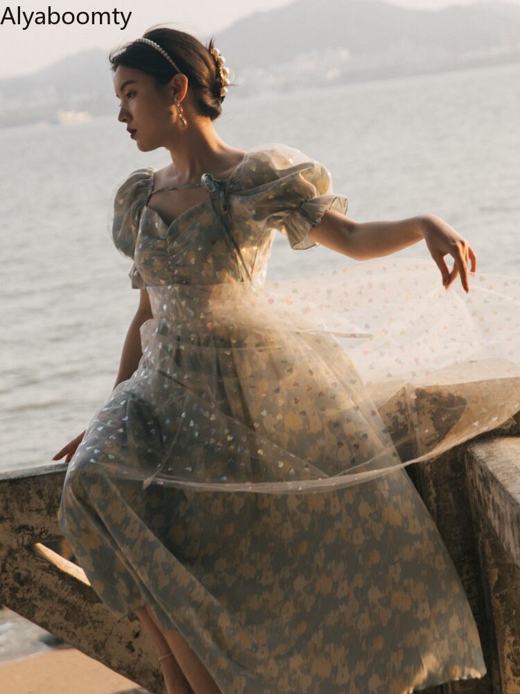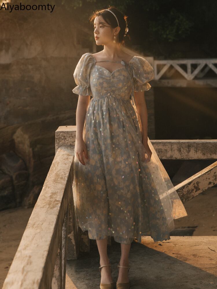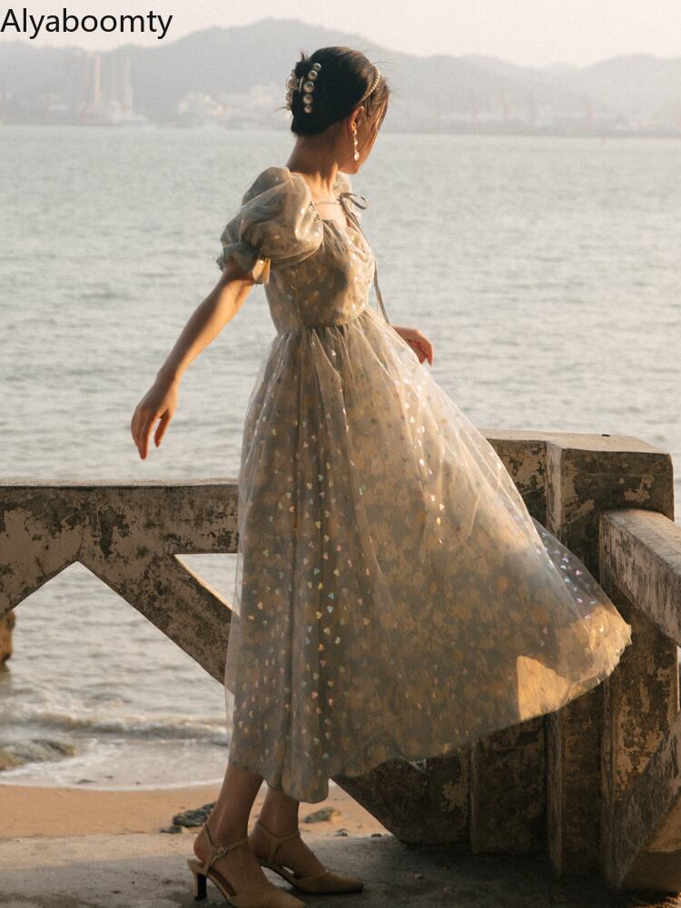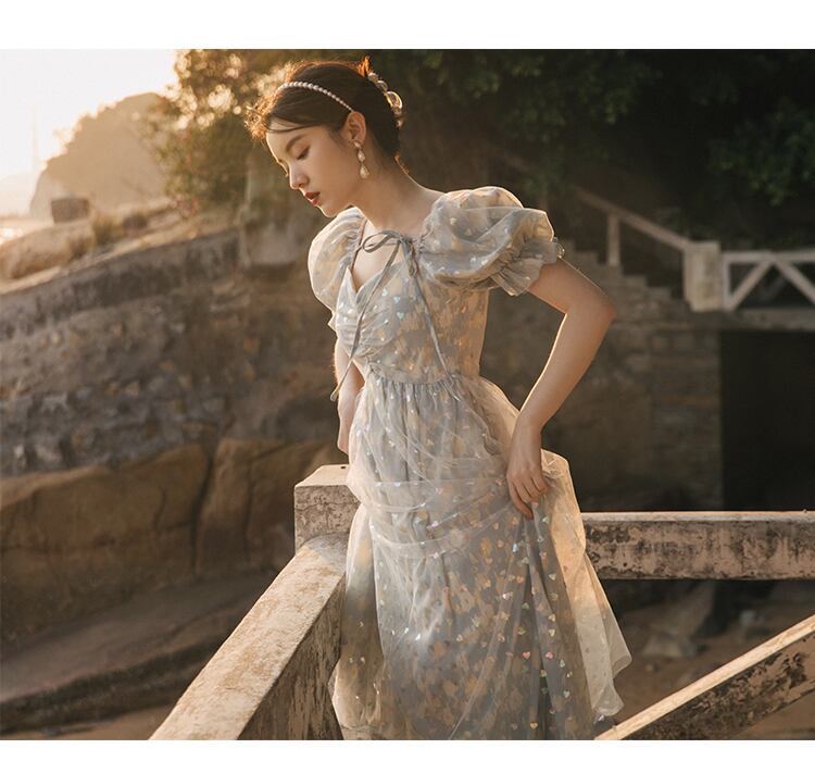送料無料୨♥୧ サマーレディースロングドレス カラーハートメッシュスリーブミディ 大人ガーリー スウィート キュート カジュアル 夏物 スクウェア AOS59681474229