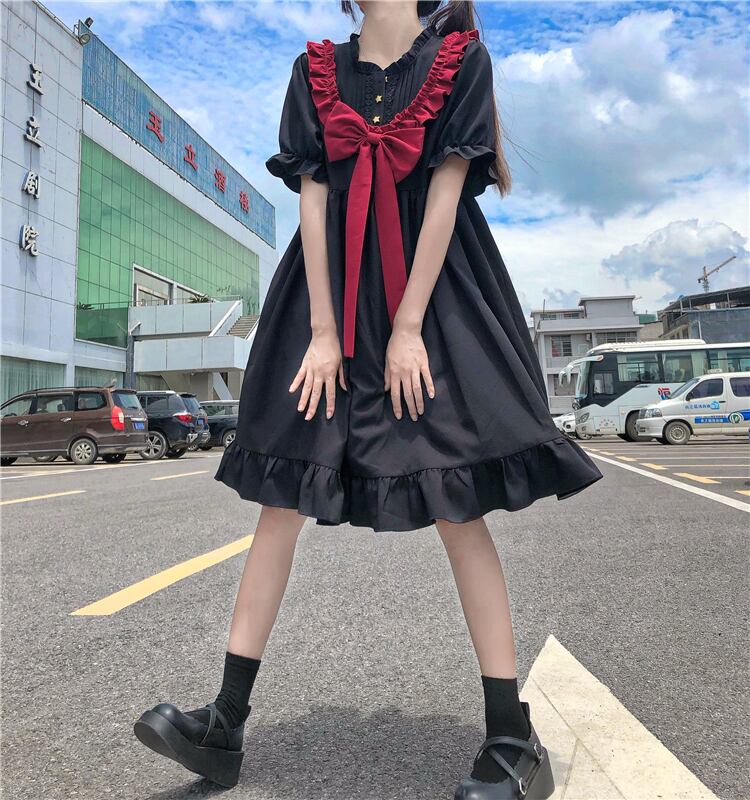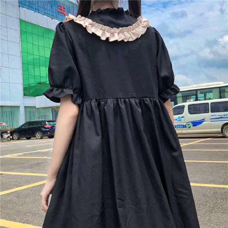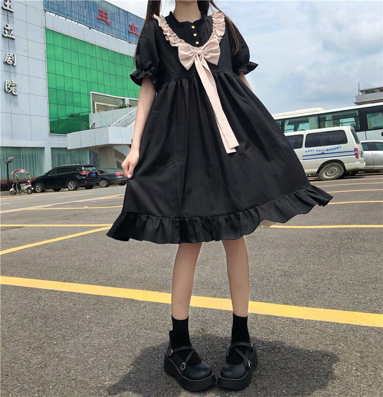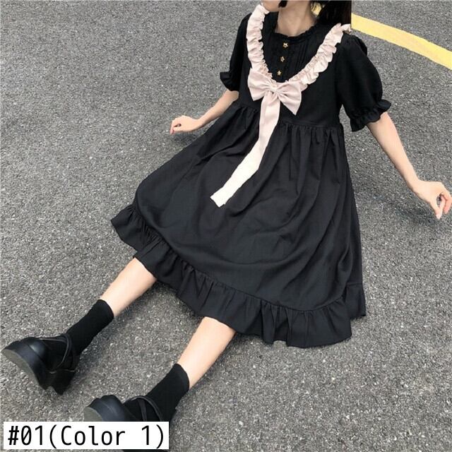 送料無料୨♥୧ サマーレディースブラックドレス カラーリボンパッチワークフリルスリーブドレス ワンピース ラッフル 大人ガーリー スウィート キュート カジュアル 夏物 AOS13505621052