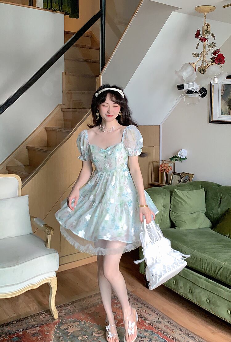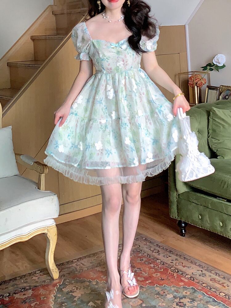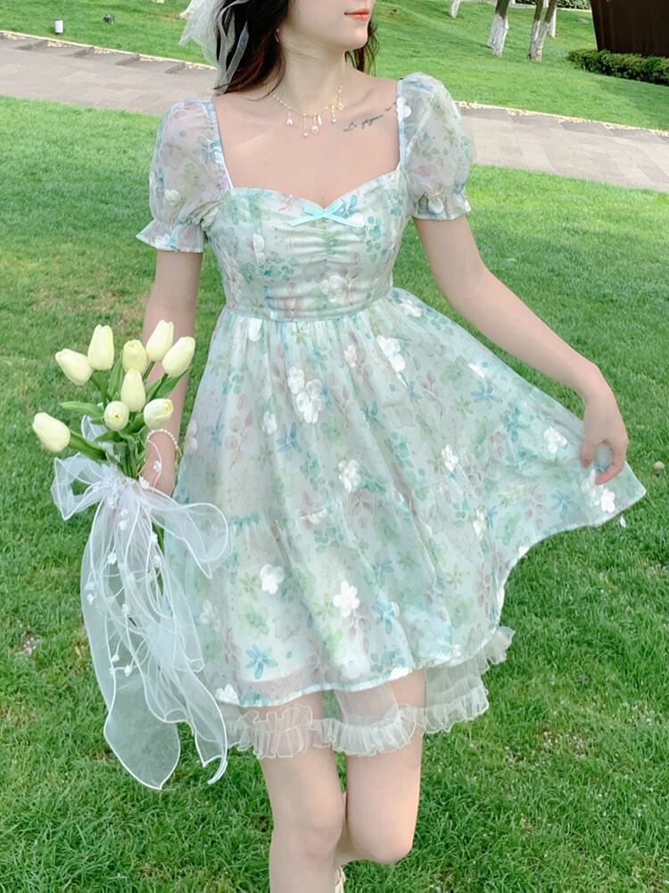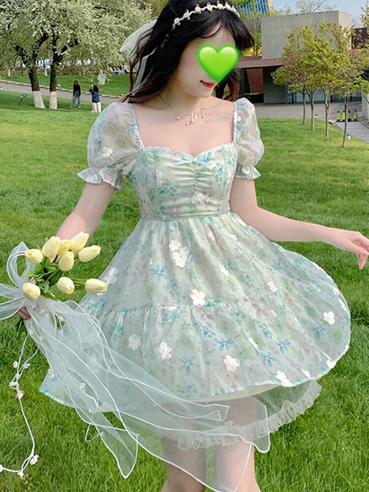 送料無料୨♥୧ サマーレディースミニドレス カラーグリーンフローラルプリント柄スリーブ刺繍フリル ラッフル 大人ガーリー スウィート キュート カジュアル 夏物 花柄 スクウェア AOS35250875859