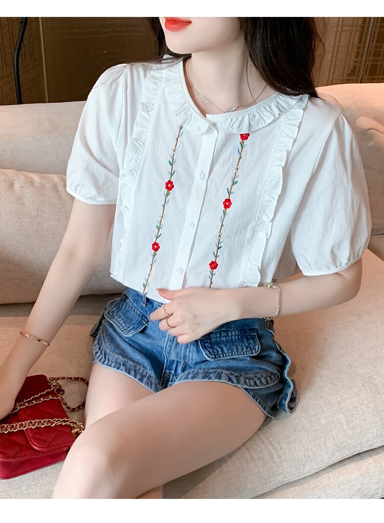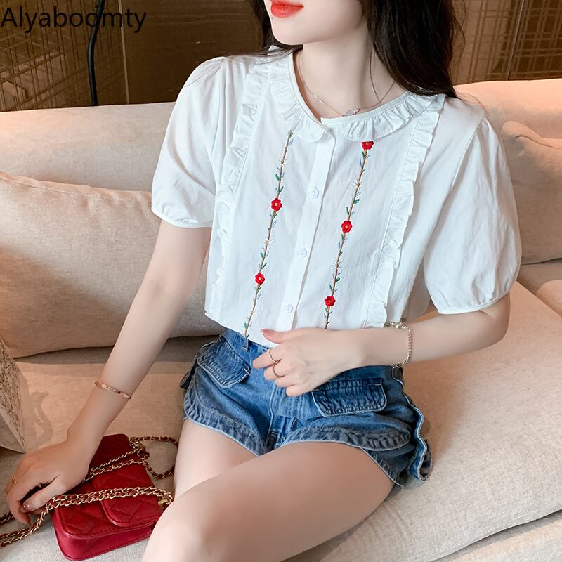 送料無料୨♥୧ サマーレディースホワイトトップス ラウンドネックルーズフローラル刺繍ブラウス 半袖スリーブ ショート ハーフスリーブ 大人ガーリー スウィート キュート カジュアル 夏物 花柄 Oネック AOS72871120898