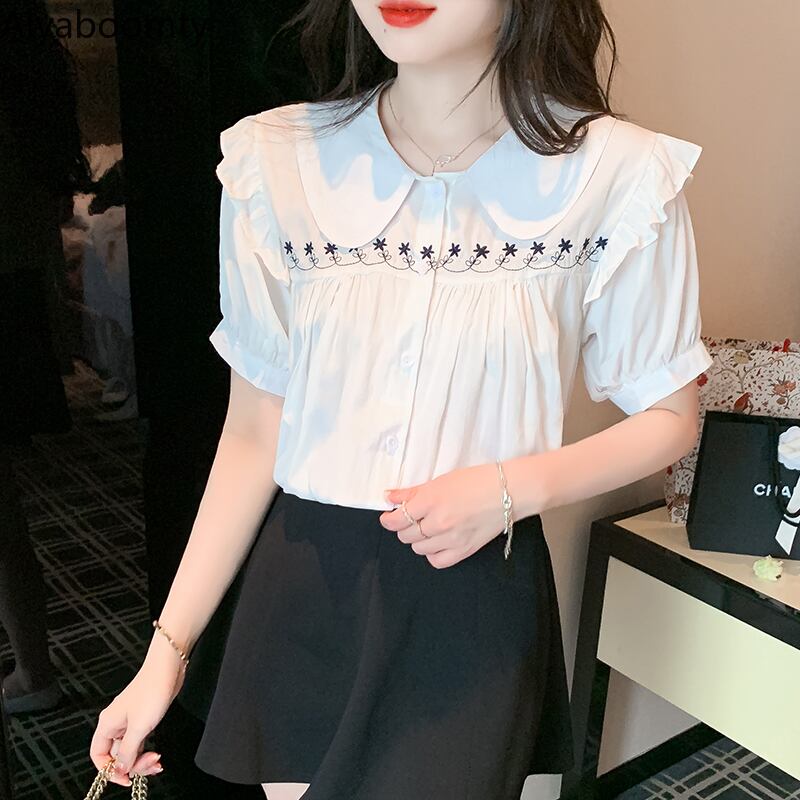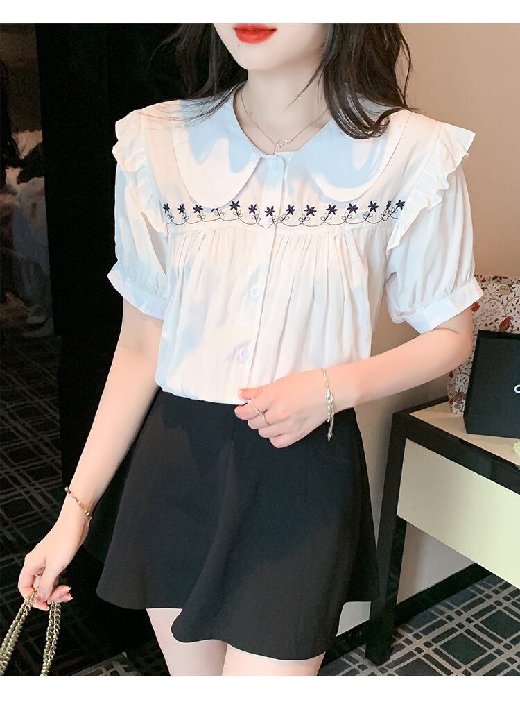 送料無料୨♥୧ サマーレディースブラウス カラーホワイトグリーンルーズフローラル刺繍トップス 大人ガーリー スウィート キュート カジュアル 夏物 花柄 AOS57782411807