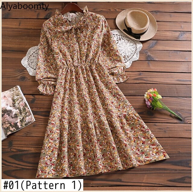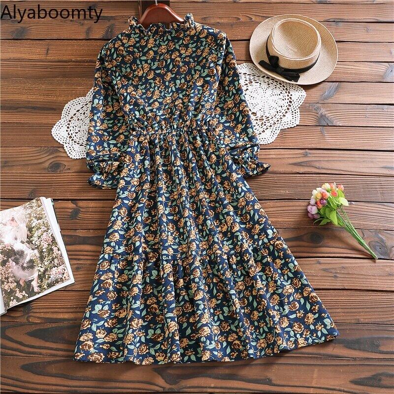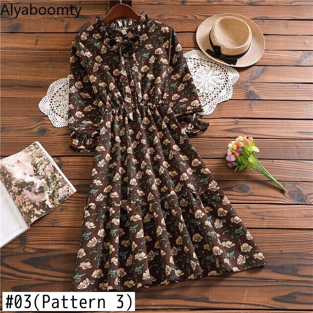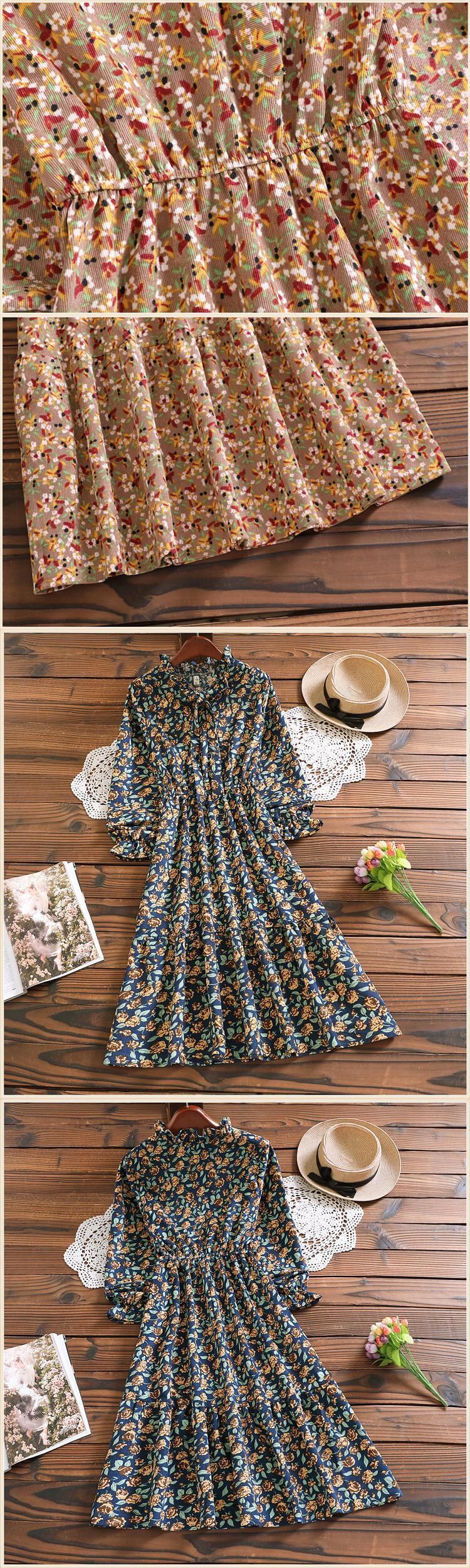 送料無料୨♥୧ スプリングレディースミディドレス カラーフローラルプリント柄ヴィンテージ長袖スリーブコーデュロイ ロング 大人ガーリー スウィート キュート カジュアル 春物 花柄 ビンテージ AOS76746869926