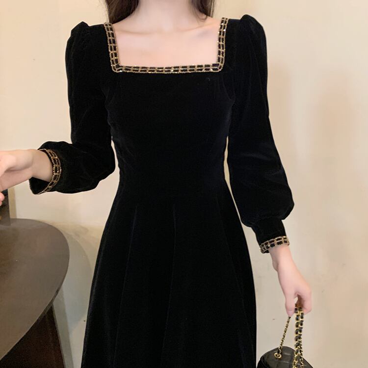 送料無料୨♥୧ スタイルオータムウィンターレディースロングドレス Vネックリボンフリルブラックベルベットドレス ワンピース ラッフル 大人ガーリー スウィート キュート カジュアル 秋物 冬物 AOS9034625327
