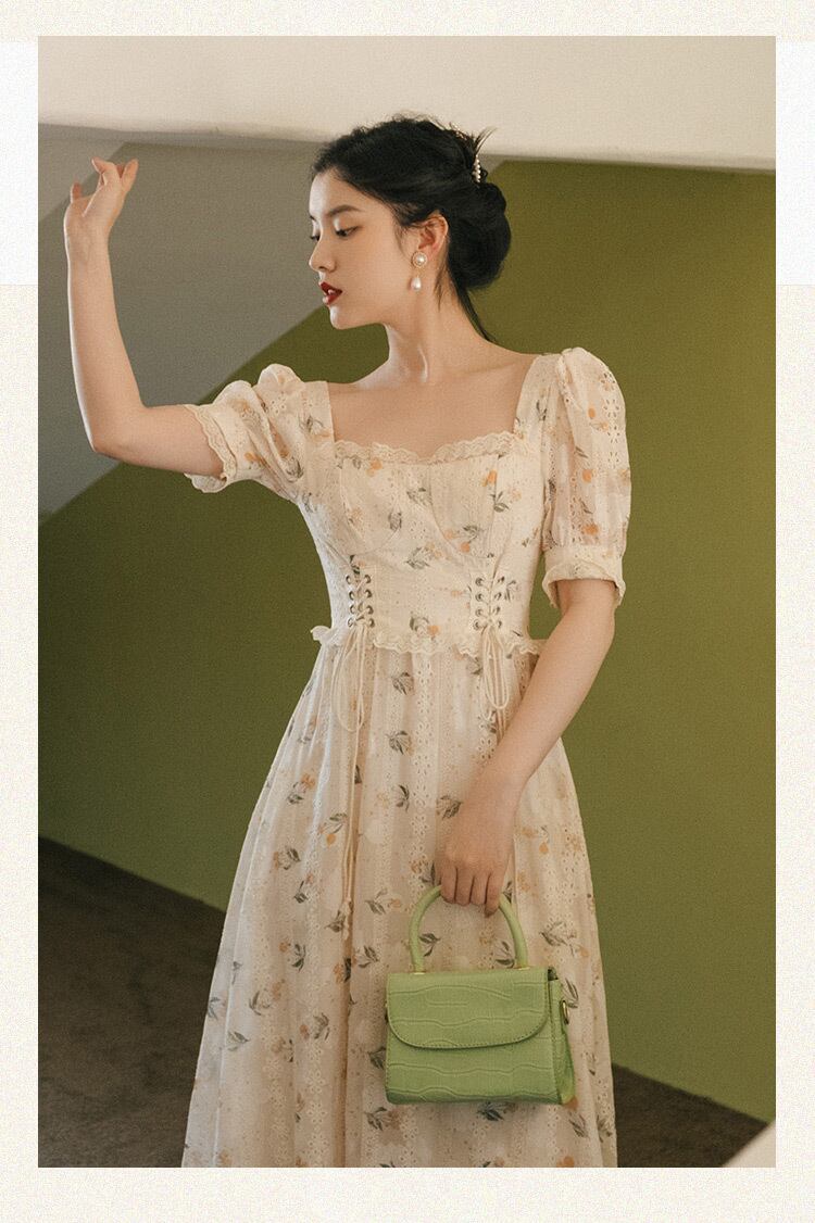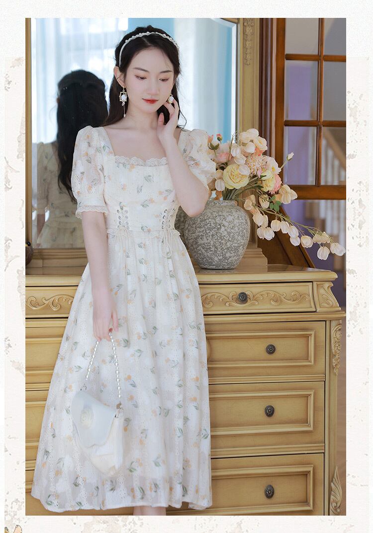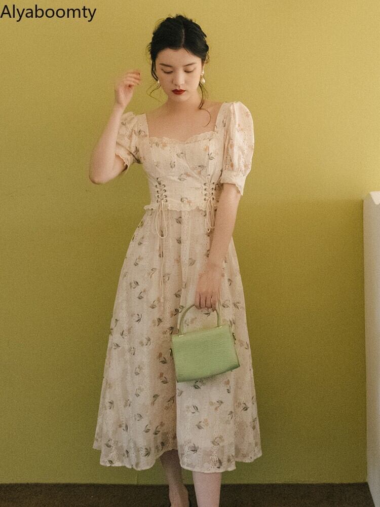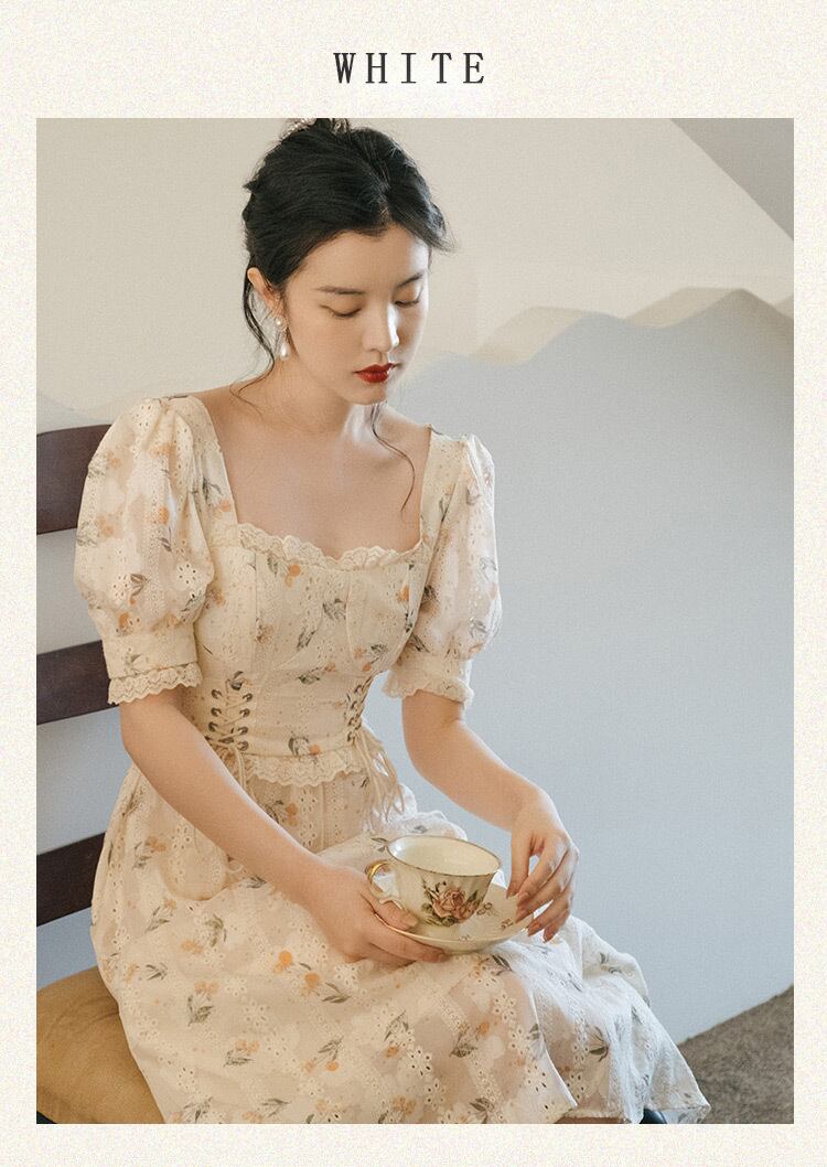 送料無料୨♥୧ サマーレディースフローラルAラインドレス カラーバンドスリーブレースドレス ワンピース 大人ガーリー スウィート キュート カジュアル 夏物 花柄 スクウェア AOS66235851831