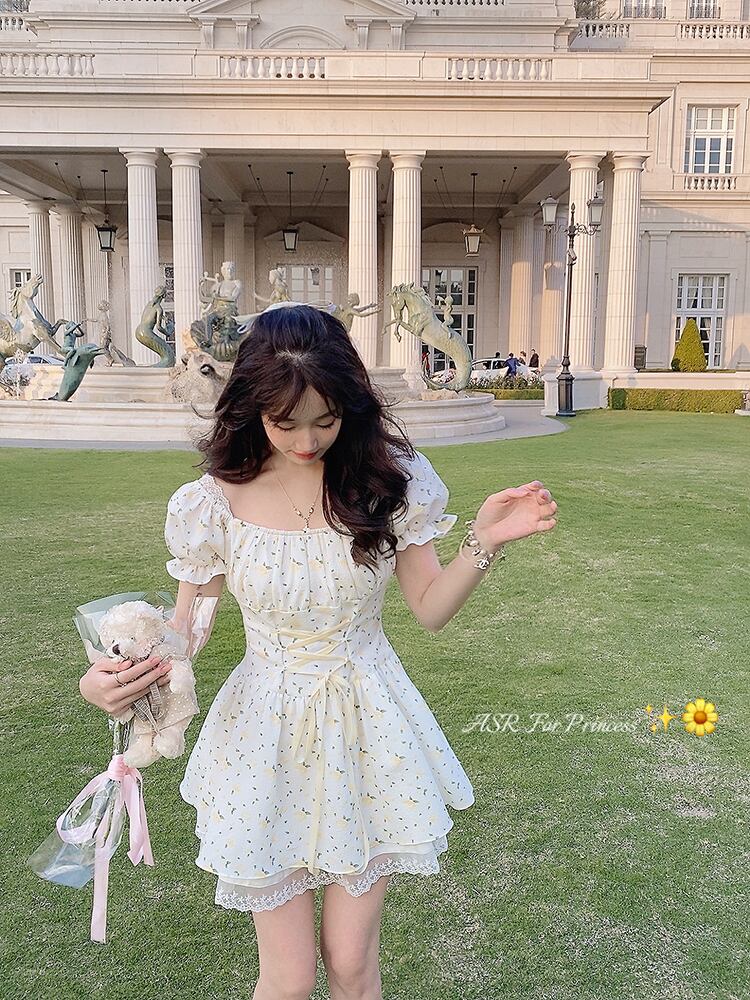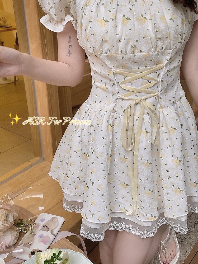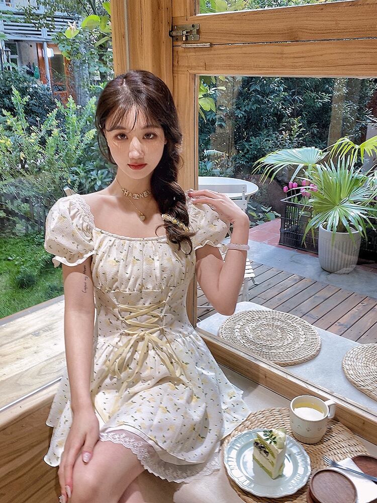 送料無料୨♥୧ サマーレディースミニドレス カラーフローラルプリントバンドスリーブレースフリル ラッフル 大人ガーリー スウィート キュート カジュアル 夏物 花柄 スクウェア AOS72720002734