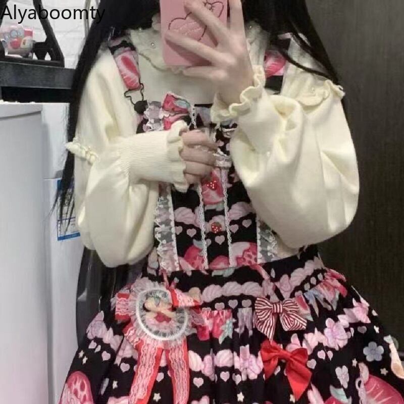 送料無料୨♥୧ オータムウィンターレディースプルオーバー フリルバギーセーター 長袖スリーブニット ロング ラッフル 大人ガーリー スウィート キュート カジュアル かわいい 秋物 冬物 パール 真珠 AOS2587618460