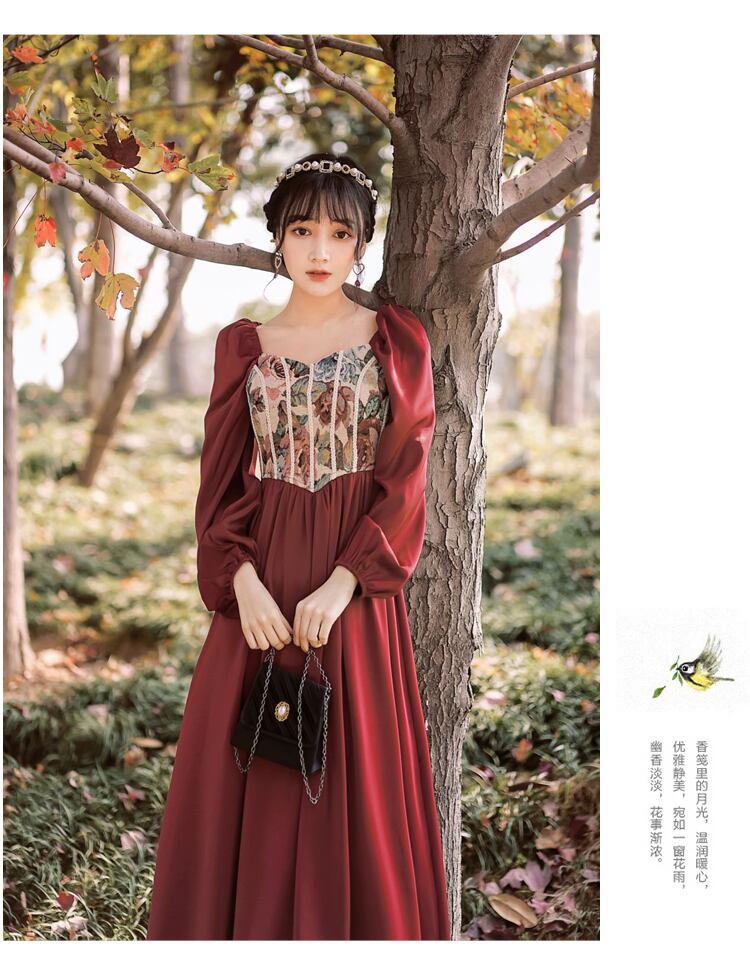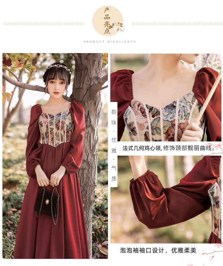 送料無料୨♥୧ スプリングオータムレディースヴィンテージレッドロングドレス カラーパッチワークスタンダードスリーブ レトロ 春物 秋物 スクウェア ビンテージ AOS11843115695