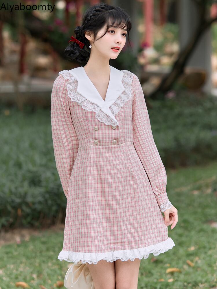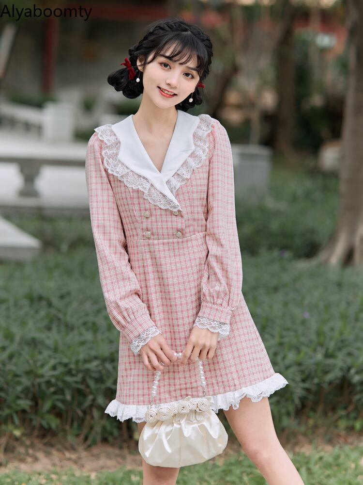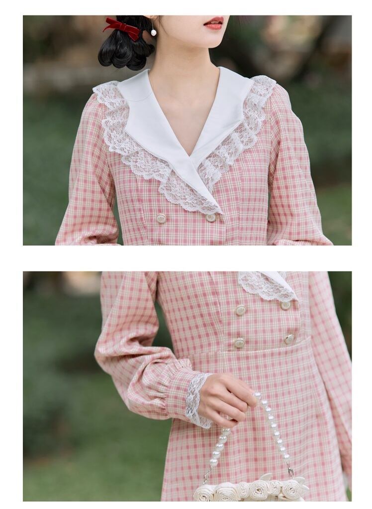 送料無料୨♥୧ スタイルスプリングオータムレディースミニドレス Vネック格子柄長袖スリーブレースフリル ロング ピンク ラッフル 大人ガーリー スウィート キュート カジュアル 春物 秋物 AOS63361479052