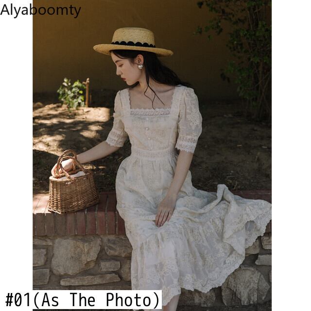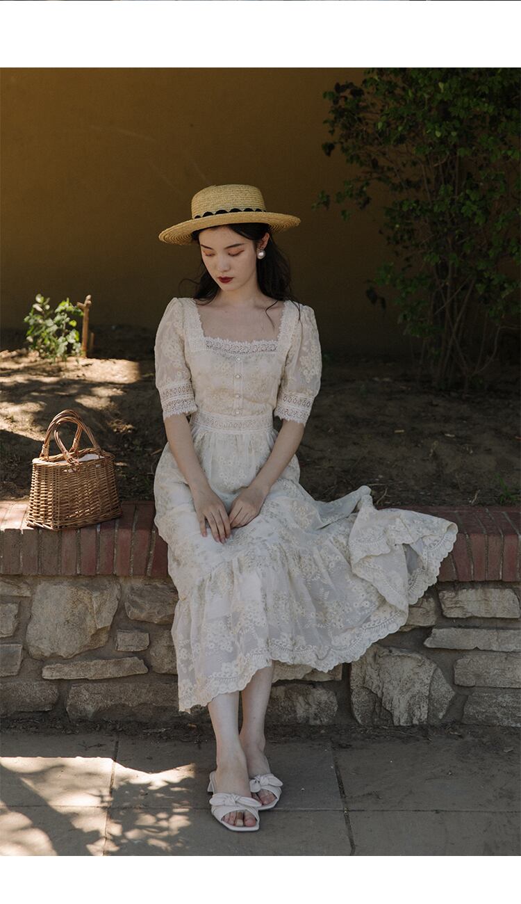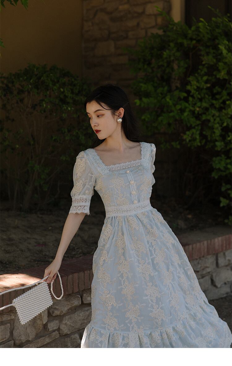 送料無料୨♥୧ サマーレディースロングレースドレス カラーブルーフローラル刺繍フリルドレス ワンピース ラッフル 夏物 花柄 スクウェア AOS64507626293