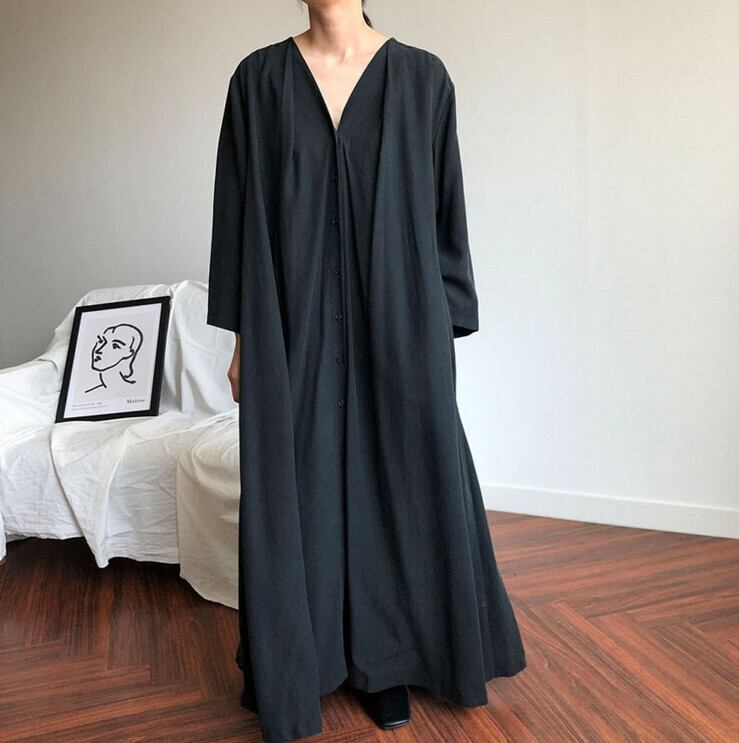 送料無料୨♥୧ スプリングオータムレディースマキシロングドレス Vネックブラックシャツ ヴィンテージ 春物 秋物 ビンテージ AOS6901903660