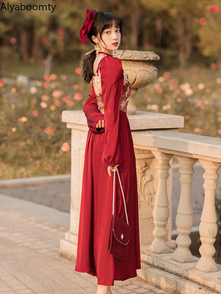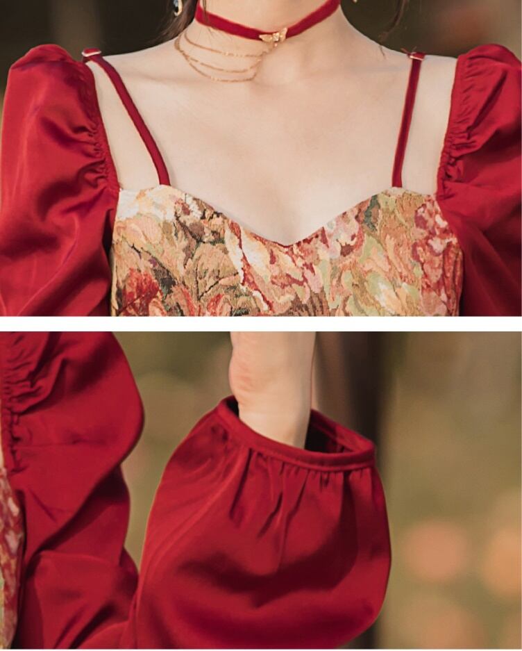 送料無料୨♥୧ スプリングオータムレディースロングスタンダードAラインドレス カラーレッドパッチワークスリーブミディ レトロ 春物 秋物 スクウェア AOS90785318299