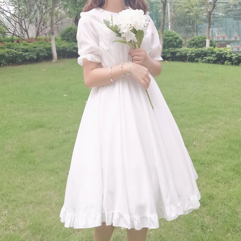 送料無料୨♥୧ サマースタイルホワイトドレス カラーウェストフリル ラッフル 大人ガーリー スウィート キュート カジュアル 夏物 パープル AOS10199773769