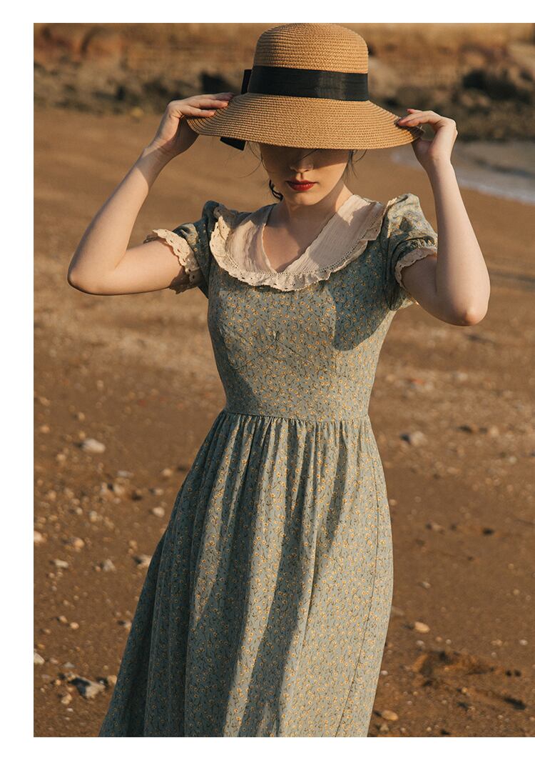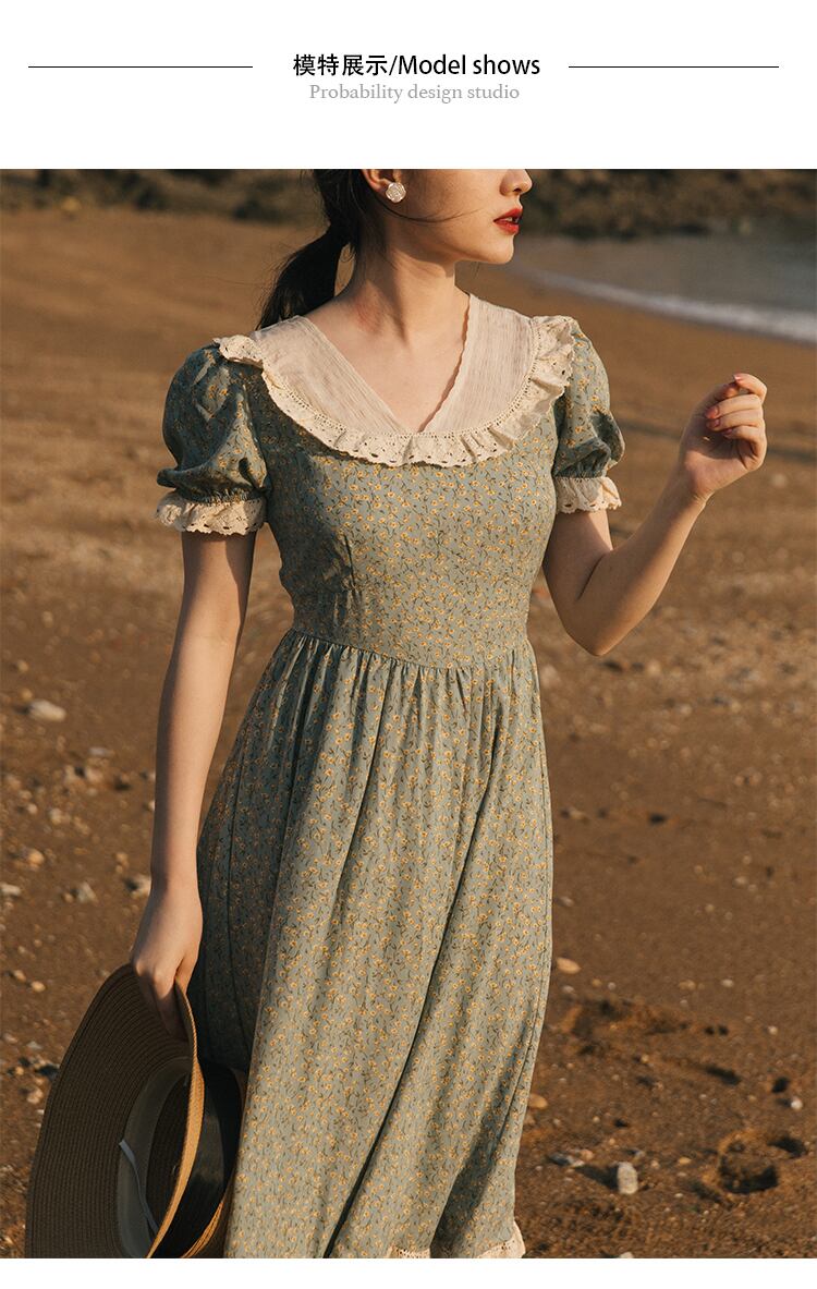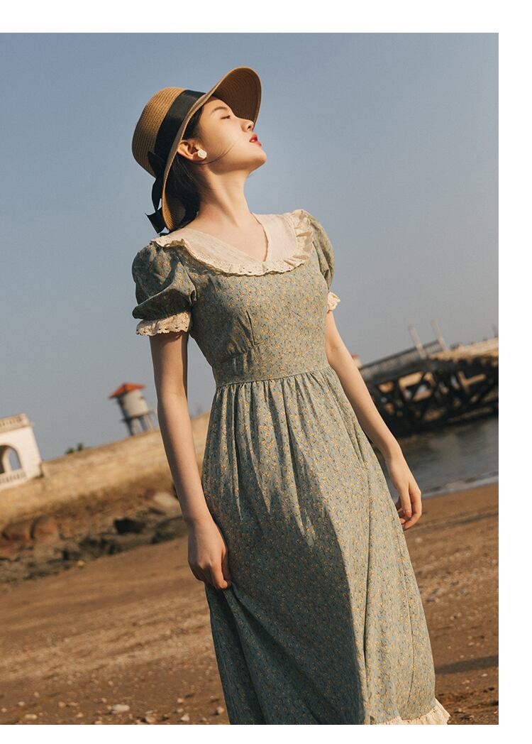 送料無料୨♥୧ サマーレディースAラインロングドレス カラーフローラルプリントシフォンスリーブレースフリルヴィンテージ ラッフル 大人ガーリー スウィート キュート カジュアル 夏物 花柄 スクウェア ビンテージ AOS1077702599